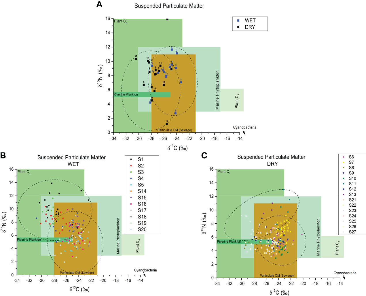For the analysis of isotopes in the suspended particulate matter (SPM), 2 L of water was filtered onboard through 0.45 µm borosilicate membranes. Filters containing recovered SPM for isotope analysis were immediately frozen at -20°C. These filters were cut into 9 mm diameter circles and decarbonated in a steaming HCl atmosphere inside a desiccator for 16 hours. The samples remained at 60°C in a drying oven for 8 hours, and the filters containing about 5 mg of particulate material were encapsulated in tin capsules for subsequent injection into the EA-EMRI. The determinations of δ13C of total organic carbon (TOC) and δ15N of total nitrogen (N) were performed using a Flash EA elemental analyser coupled to the Delta V Plus isotopic ratio mass spectrometer from Thermo. Two pulses of reference gas (N2) with an intensity of 7000 mV were introduced at the beginning of each run, and two pulses of reference gas (CO2) with an intensity of 14000 mV at the end of the run. The reference gases were previously calibrated from the average value obtained after ten determinations of the IAEA USGS40 certified standard. The results of δ15N and δ13C are expressed in parts per thousand (‰), calculated according to the value of the second pulse of their respective reference gas. Values are reported as the average of two injections. The detection and quantification limits of the δ13C and δ15N analyses are related to the amplitude of the analyte’s signal, estimated at ≥ 500 mV (DL). To ensure the analytical quality of the results, the IAEA USGS40 certified standard was injected every six injections (or three samples), with a deviation of less than ± 0.5 ‰ being accepted. Due to analytical limitations, isotopic analysis was performed only in the first twelve campaigns in the river channel.