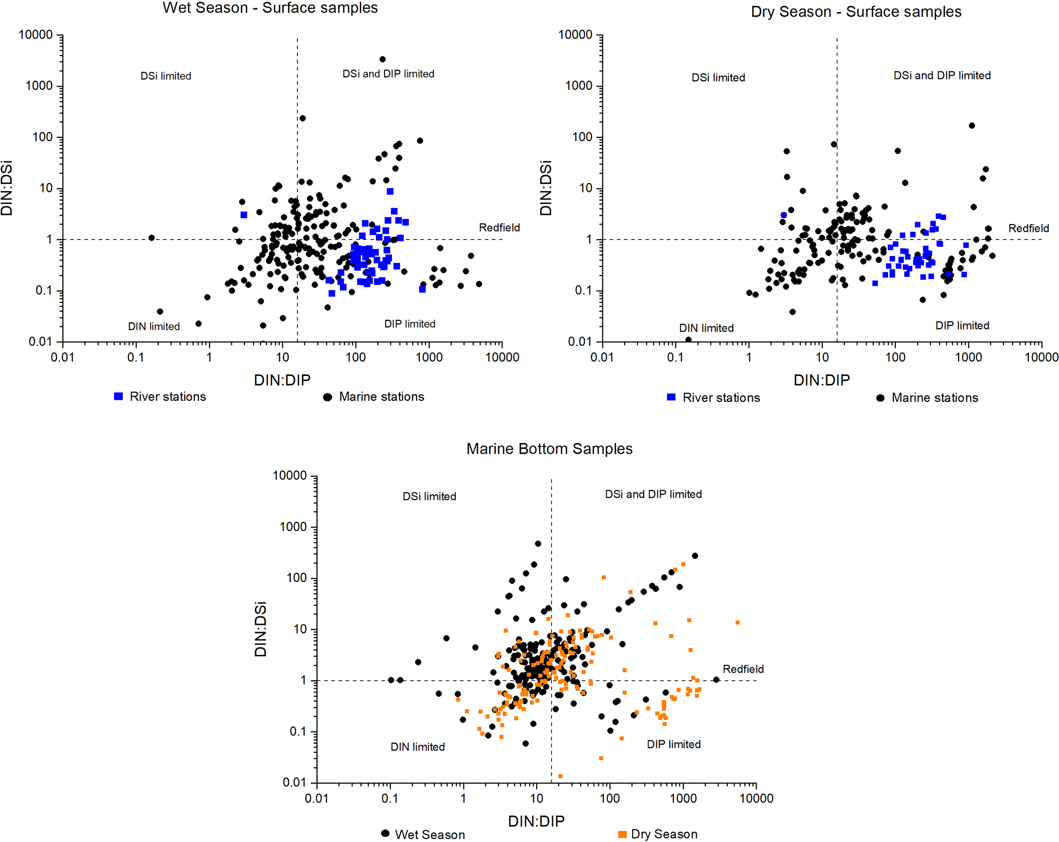 According to the concentrations of nutrients in the surface waters, TP was approximately five-fold higher in the river channel (1.71 ± 2.14 μmol/L) than on the continental shelf (0.38 ± 0.25 μmol/L) in the wet season, with no significant differences on the continental shelf surface and bottom waters during both dry (0.5 ± 0.3 μmol/L vs. 0.56 ± 0.47 μmol/L) and wet (0.38 ± 0.25 μmol/L vs. 0.41 ± 0.24 μmol/L) seasons (Mann-Witney, p > 0.05). (Table 2). TP was slightly more concentrated in the river when the flow was lower. In the surface water, the DIP levels in both regions did not show significant differences in the dry and wet seasons and were about two-fold higher in the river channel than on the continental shelf. Within the continental shelf, there were no statistically significant differences (Mann-Witney, p > 0.05) between the surface and bottom waters.