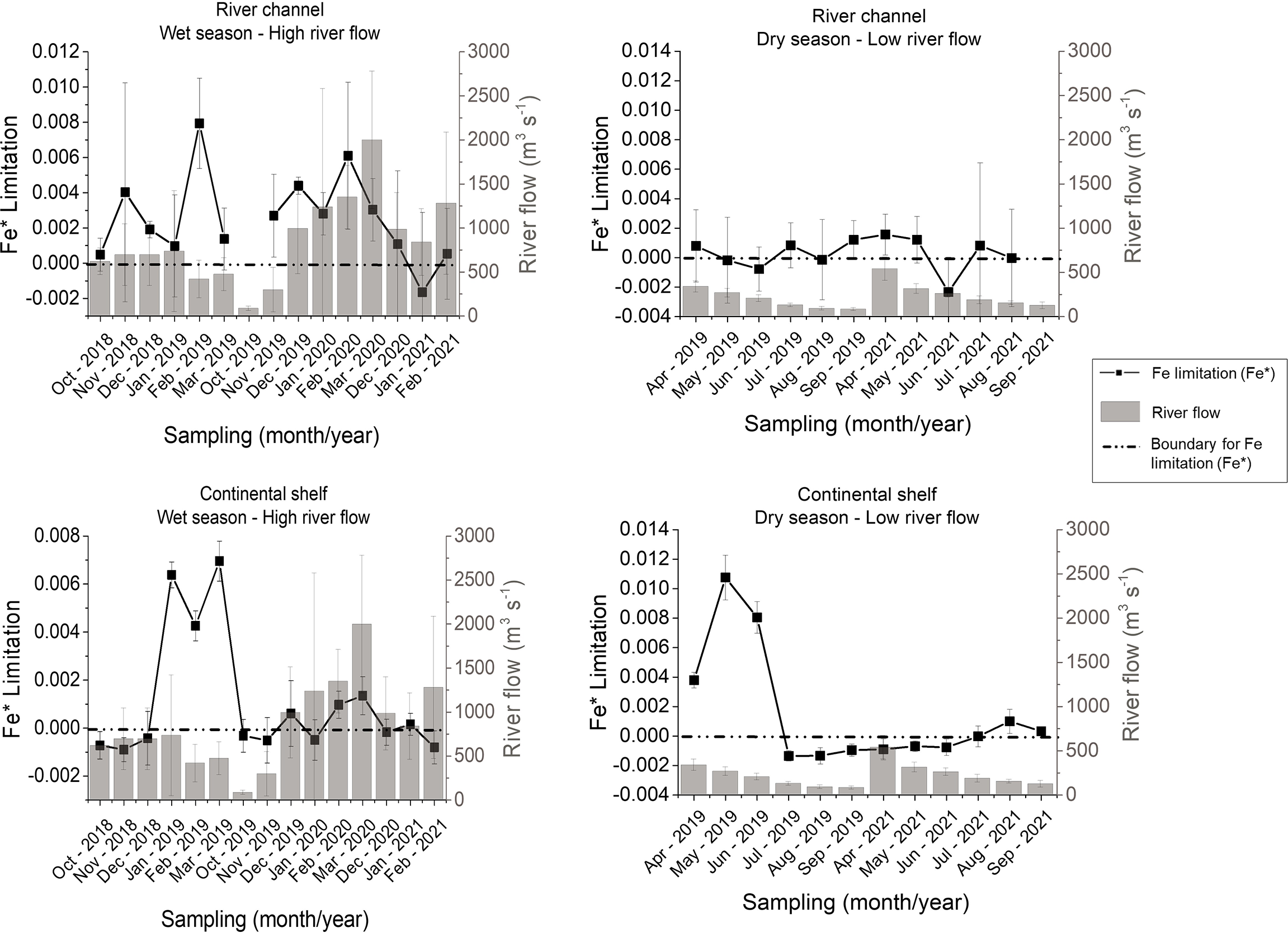 Environmental limitation regarding dissolved iron levels (DFe) was evaluated from the Fe tracer (Fe*), which corresponds to the biological demand of DFe needed for orthophosphate assimilation by the phytoplankton (Parekh et al., 2005; Zhu et al., 2017). Equation 1 includes the ratio of 7.5 mmol DFe: 1 mol DIP (Bristow et al., 2017) for determining DFe bioavailability or limitation as: