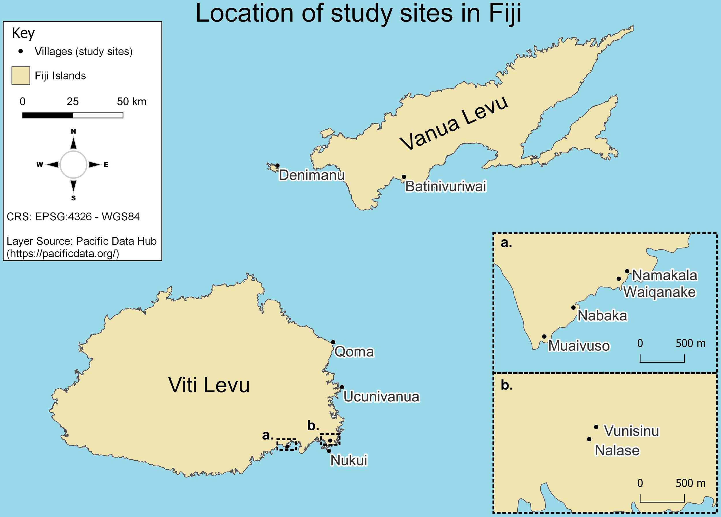 Map showing the study in the Fiji Islands. Inset map (A) villages in Dreketi (Vunisinu and Nalase; (B) Vanua Navakavu (Muaivuso, Nabaka, Waiqanake and Namakala). Source: Flanders Marine Institute (2022). Maritime Boundaries Geodatabase, version 11. Available online at https://www.marineregions.org/http://doi.org/10.14284/382.