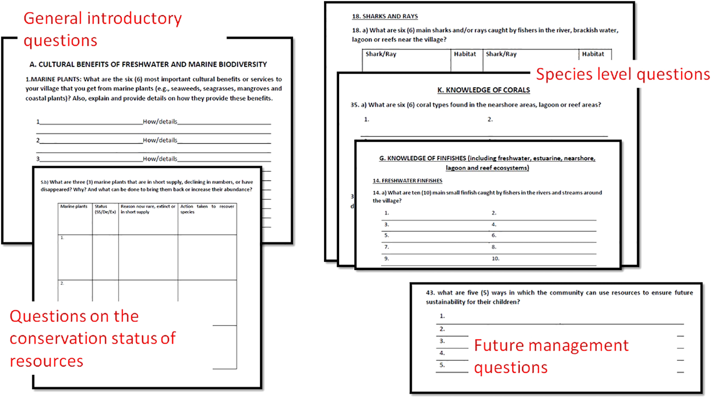 An in-depth questionnaire was used for the group interviews and a researcher administered the sessions. Open-ended questions were used to allow open responses from the participants. The groups were made of 5 – 8 women and meetings were arranged with the fisherwomen on a time when participants were available (on evenings or during the Women’s group weekly community meeting). A total of 81 fisherwomen between 18 – 59 years of age participated in this survey. The questionnaire was designed with repetition, focusing on the same questions from several standpoints. For example, introductory questions required fisherwomen to identify the marine or freshwater plants and animals which are culturally or ecologically important then elaborate their values. The follow up questions separated marine and freshwater resources into families and further into species while documenting the species biological, cultural and ecological knowledge from the fisherwomen’s perspectives (Figure 2). The fisherwomen were required to use only the local names when identifying resources. The local names of species were linked to scientific names using reference books including Allen and Steene’s Indo-Pacific coral reef guide (2007), Colin and Arneson’s Tropical Pacific Invertebrates (1995), Bergbauer and Kirschner’s Reef fishes of the Indo-Pacific (2020), Wye’s Pocket guide to shells (2007) and Randall’s Reef and shore fishes of the South Pacific (2005). Quantitative information on the number of species identified and the number of local names were counted and tallied for all communities and represented in the tables and graphs.