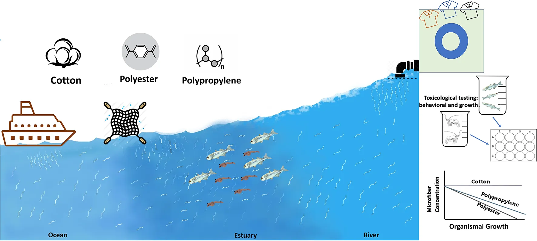 In summary, natural microfibers were identified as least toxic when compared to the other two synthetic microfiber types in this study, but they still caused adverse responses in terms of growth in mysids and altered behavior in both taxa. Similar results were reported in brine shrimp Artemia franciscana when exposed to two commonly synthetic microfibers (polypropylene and polyethylene terephthalate) and one natural fiber (lyocell) (Kim et al., 2021). Based on behavioral variability mysids shrimps are more affected by polyester microfibers whereas Silverside larvae were more impacted by polypropylene microfibers. Both organisms demonstrated the lowest impact from the cotton microfibers. When considering salinity, cotton impacted both fish and invertebrate behavior more at higher salinities, whereas polyester and polypropylene had higher impacts at lower salinities. Also, overall, in terms of internalization and effects on growth, cotton has a lesser impact compared to synthetic fibers. This study contributes to our understanding of impacts to growth and the behavioral ecotoxicology of microfiber exposure and identifies potential risks associated with each. Our results support proposed efforts to reduce the loading of microfibers into the environment, such as potentially requiring filtration devices on washing machines and clothes dryers (Erdle et al., 2021). The impact of microfibers on growth and behavior in both organisms tested here is concerning, and further investigations are needed to better understand the behavior of microfibers across salinities, as well as the potential relationship between changes in apical endpoints, such as growth, and altered behavior.