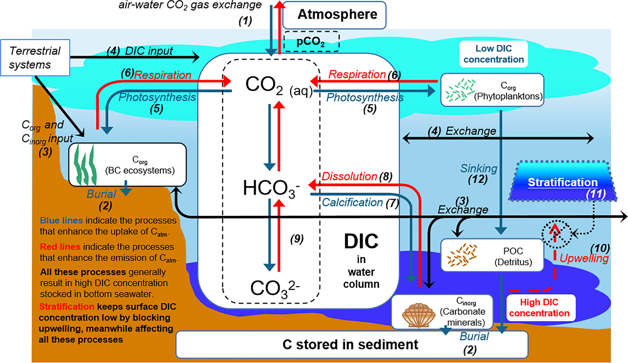 Here, we discuss the fundamental processes that critically affect the distribution and dynamics of DIC and surface pCO2 in SCWs. Surface water DIC and pCO2 would be reduced, since allochthonous organic carbon (Corg) and inorganic (Cinorg) ((3) in Figure 1) and DIC inputs ((4) in Figure 1) are low. Net autotrophic ecosystems (i.e., seagrasses, phytoplankton) would reduce surface DIC and pCO2, then show a net uptake for atmospheric CO2 through photosynthesis ((5) in Figure 1) (Maher and Eyre, 2012; Tokoro et al., 2014; Nakayama et al., 2020). Respiration will increase DIC and pCO2 ((6) in Figure 1). The formation of calcium carbonate minerals will decrease DIC by calcification ((7) in Figure 1) and increase DIC by dissolution ((8) in Figure 1). Additionally, the reactions of the DIC cycle ((9) in Figure 1) can change the pCO2 in surface water and therefore affect the net exchange of CO2 with the atmosphere (Howard et al., 2017; Macreadie et al., 2017; Howard et al., 2018). According to these processes, the DIC in bottom water is generally much higher than that in surface water and will usually mix with surface water by upwelling ((10) in Figure 1). However, stratification ((11) in Figure 1) occurs seasonally in SCW regions, mainly in summer (Wakeham et al., 1987; Wiseman et al., 1997), which can hinder the upwelling of bottom water with a high DIC concentration to suppress increases in DIC and pCO2 in the surface water. In addition, unlike the effects of stratification on bottom DIC behavior, the sinking of particle organic carbon (POC) ((12) in Figure 1) from seawater surface is not hindered by stratification (Koné et al., 2009).