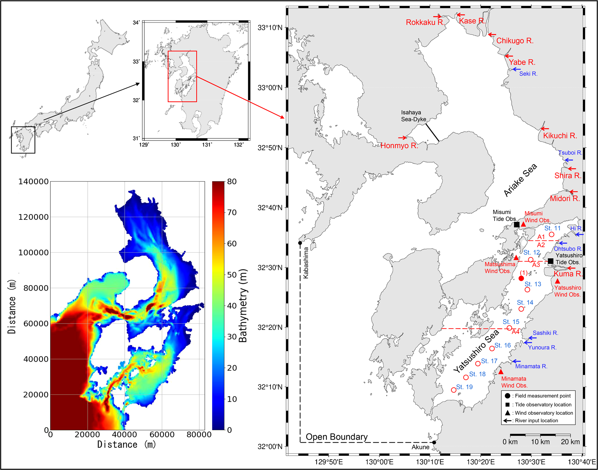 In this study, we refined the resolution of the vertical direction to further improve the accuracy of the vertical direction based on a general 3D coastal current model developed by Yano et al. (Yano et al., 2010) in order to simulate the effects of stratification more accurately. The computational domain of this model, which covers both the Ariake Sea and the Yatsushiro Sea (Figure 2).