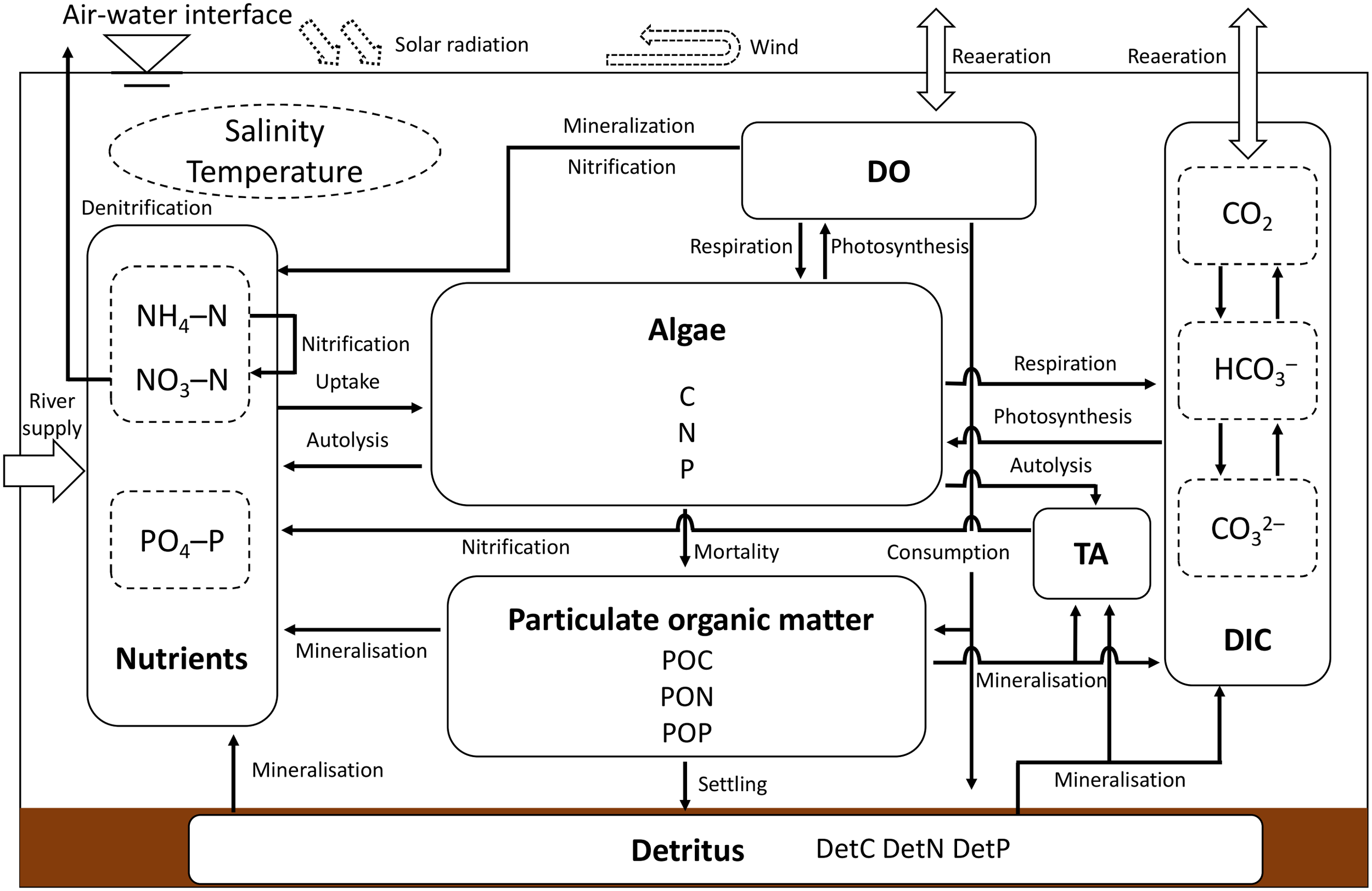 Delft3D-WAQ is a module of the ecological section that is used to simulate biological processes in water bodies and sediments and various processes of solute transport and transformation. The WAQ module mainly solves the advection–diffusion–reaction equations for each computational grid by combining the results of the FLOW module (e.g., the spatial and temporal distribution of salinity, water temperature, velocity, and turbulence dispersion coefficient). Therefore, the computational domain, resolution, number of layers in the σ-coordinate system, location of the freshwater inflow, and flow velocity are the same as those in the hydrodynamic model. In addition, all the physical conditions used for the FLOW module (e.g., the solar radiation, air temperature, humidity, wind, river inflow) were coupled into the WAQ module, and the start pattern (e.g calculation time frame and time step) were the same as the FLOW module. This ecological module offers the user a wide range of frameworks for choosing the substances and processes to be simulated, giving more flexibility in simulating physical, biochemical, and biological processes (Deltares, 2018). The structural diagram of the ecological model used in this study (Figure 3). The interaction of phytoplankton dynamics, nutrients cycling, and inorganic carbon cycling are considered in this model as the key process affecting the objective of this study (i.e., pCO2 dynamics in the water column).