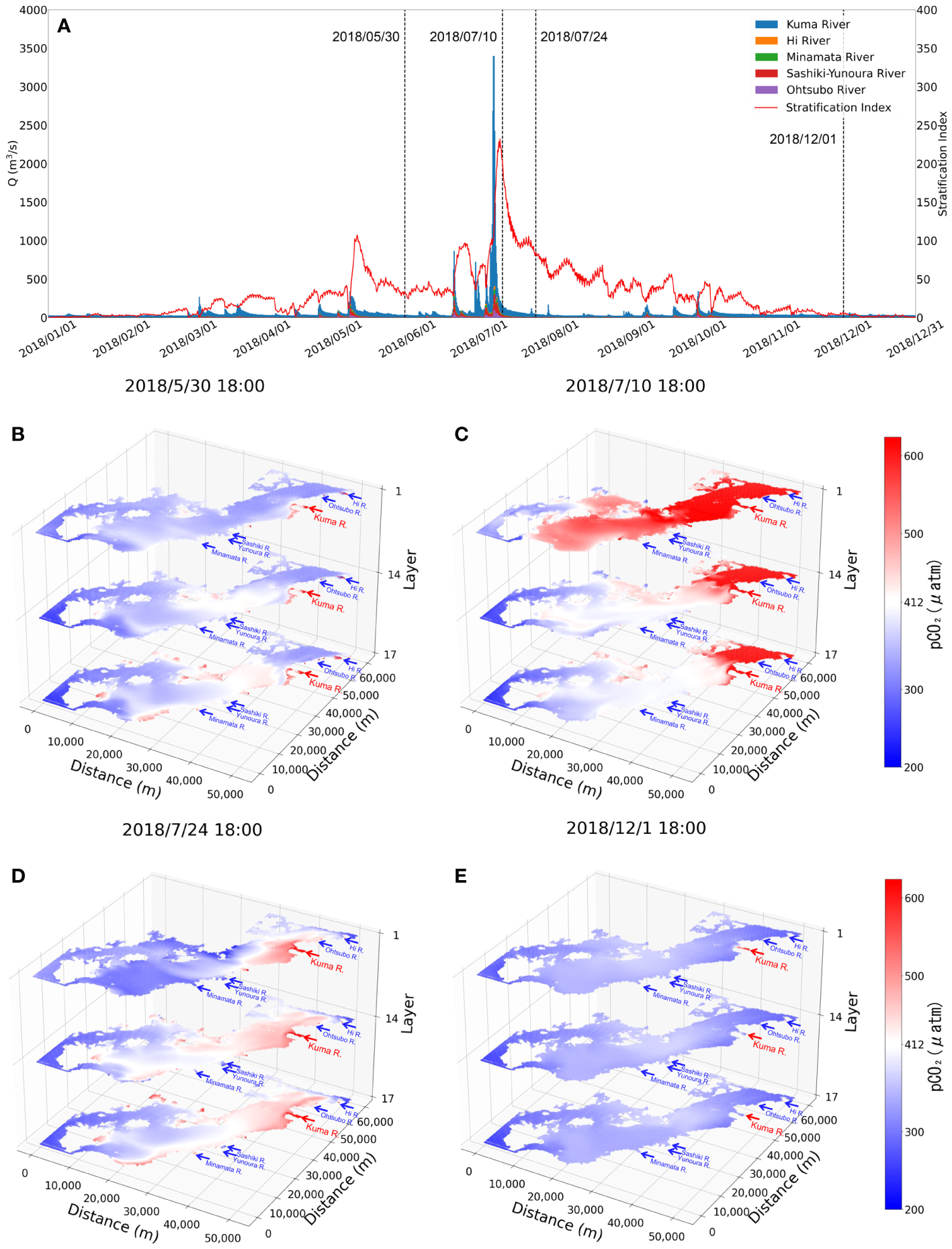 This study has three primary objectives: (1) to examine the vertical distribution and dynamics of DIC and pCO2 under different stratified conditions in the Yatsushiro Sea, Japan, by conducting field measurements under the three most representative stratification conditions within the hourly scale; (2) to develop a high vertical resolution hydrodynamic-ecological 3D numerical model that can accurately describe the vertical distribution and dynamics of DIC and pCO2 under stratified conditions in the bay; (3) to analyze the CO2 dynamics and the corresponding influence mechanism of the bay and estimate the 2018 FCO2 through the numerical simulation results.
