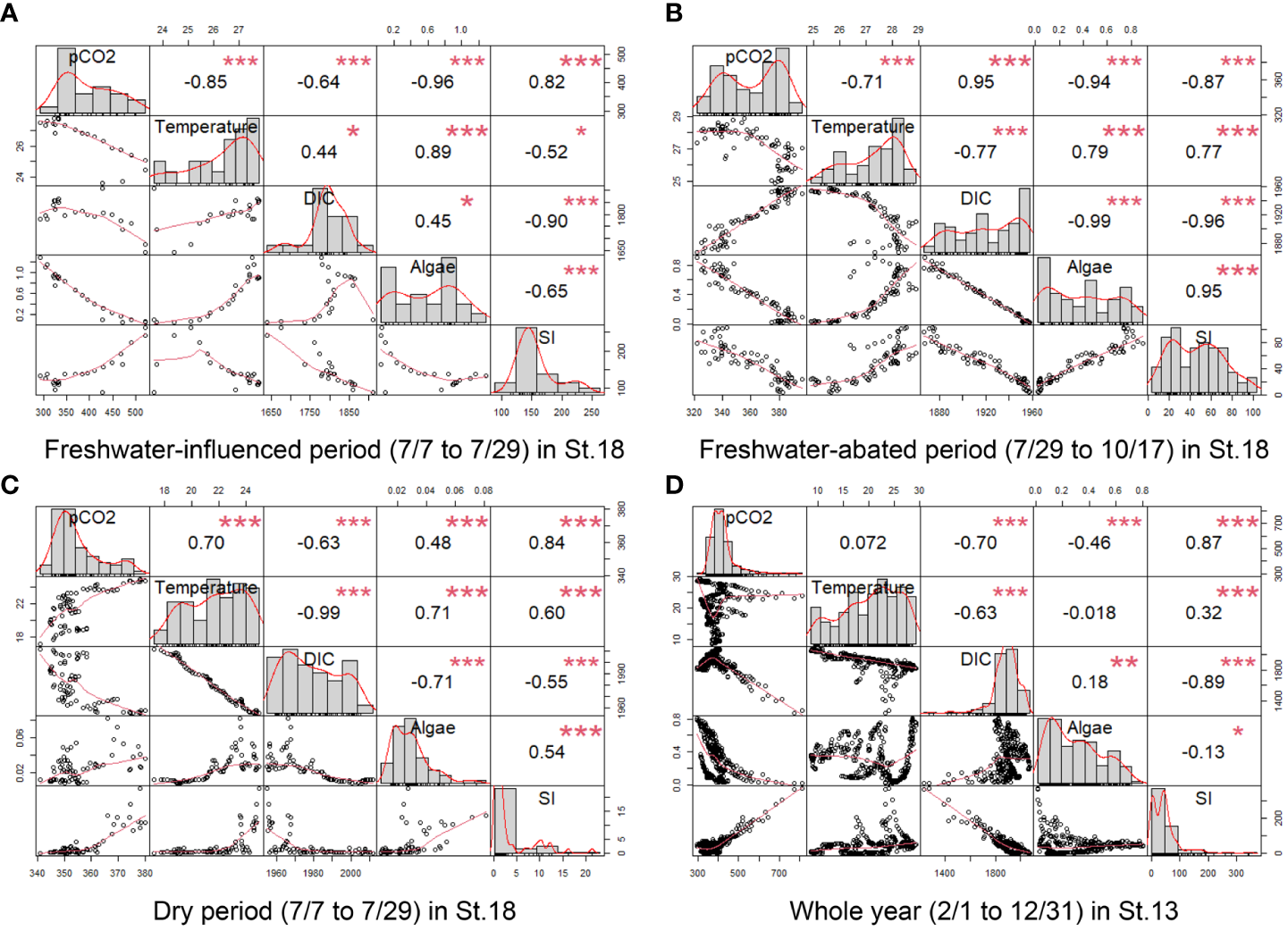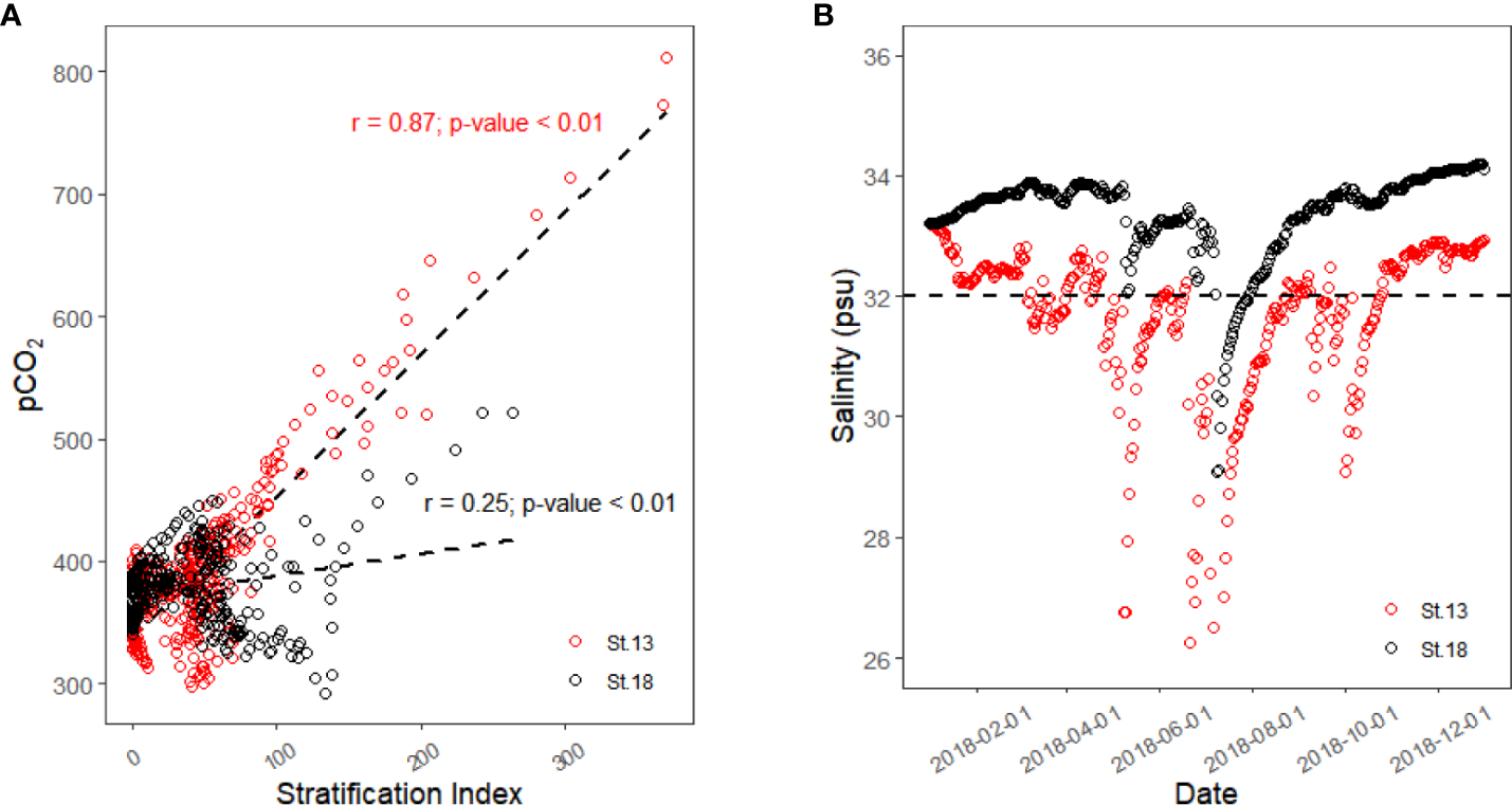Stratification controls DIC and the vertical distribution of other water properties (i.e., water temperature, salinity, nutrients, phytoplankton, and dissolved oxygen) (Sylaios et al., 2006; Boldrin et al., 2009; Howarth et al., 2011). Water temperature negatively correlates with CO2 solubility, and DIC in seawater shows a strong dependence on salinity in several shallow coastal regions (Bakker et al., 1999; Eyre, 2000). Phytoplankton in surface water can reduce pCO2 through photosynthesis, and nutrients enhance the growth of phytoplankton and other net autotrophic ecosystems. Moreover, stratification suppresses the upwelling of suspended particles from bottom waters; improves transparency, thereby promoting photosynthesis; and decreases the amount of pCO2 in the surface water (Chen et al., 2008). Furthermore, despite the controversy, studies have shown that the mineralization rate is low under hypoxic conditions caused by stratification (Hartnett et al., 1998; Koho et al., 2013). These results indicated that stratification appears to be a critical environmental parameter for the distribution and dynamics of DIC and pCO2 in SCWs, thereby strongly affecting the FCO2. Moreover, many studies have reported the potential relationship between CO2 dynamics and stratification in coastal seawater, but since these studies only measured CO2 data in surface seawater, the interaction between CO2 dynamics and stratification in the detailed water column is still unclear (Shim et al., 2007; Zhai and Dai, 2009; Wang and Zhai, 2021). For this purpose, fully understanding the effects of stratification on submerged carbon biogeochemical processes and air–water CO2 exchanges in SCWs is highly significant for helping us to understand the role of SCWs in climate change mitigation.