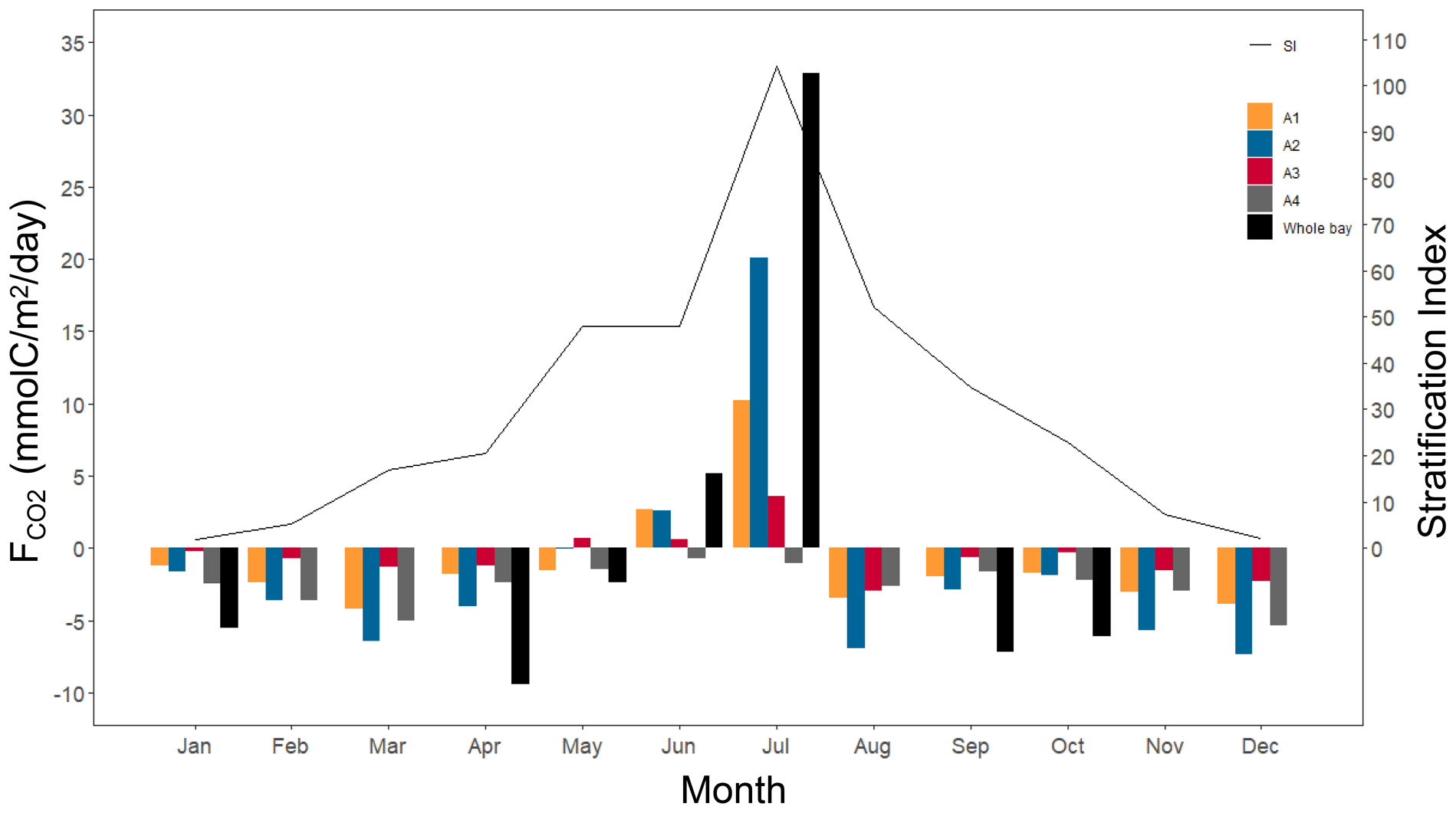 carbon dioxide, shallow coastal waters, 3D numerical model, field measurement, stratification, blue carbon