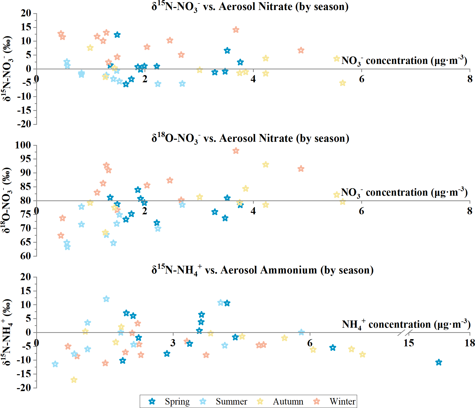 Aerosol nitrate and ammonium isotopic compositions plotted against aerosol nitrate and ammonium concentrations with samples coded by seasons at the Qianliyan Island in 2018.