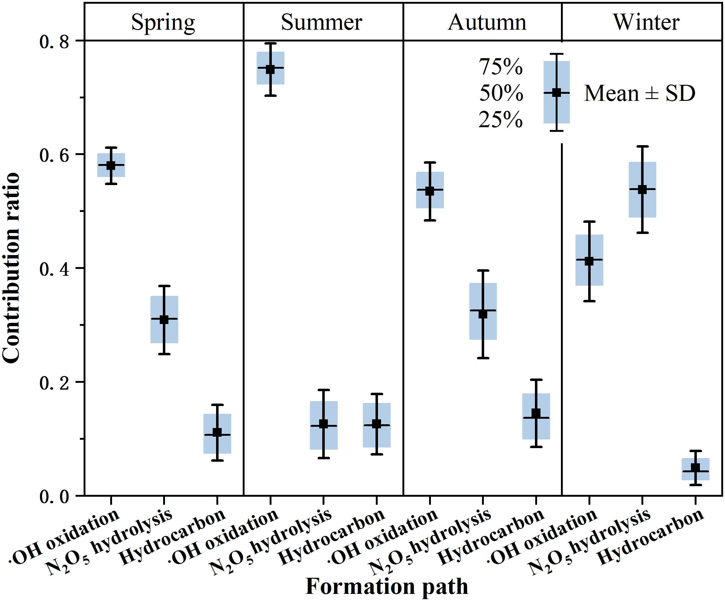 Inferred from a three-endmember model, the results showed that •OH oxidation and N2O5 hydrolysis paths were two main formation pathways for aerosol nitrate formation (Figure 3). The average contribution of the •OH oxidation path was high in summer (74.9 ± 4.7%) and low in winter (41.2 ± 7.0%); N2O5 hydrolysis path was low in summer (12.6 ± 5.9%) and high in winter (53.8 ± 7.6%), indicating a transition of the leading pathway of nitrate formation from the •OH oxidation in summer to the O3 oxidation in winter because N2O5 was produced by O3, which reacts with NO2.