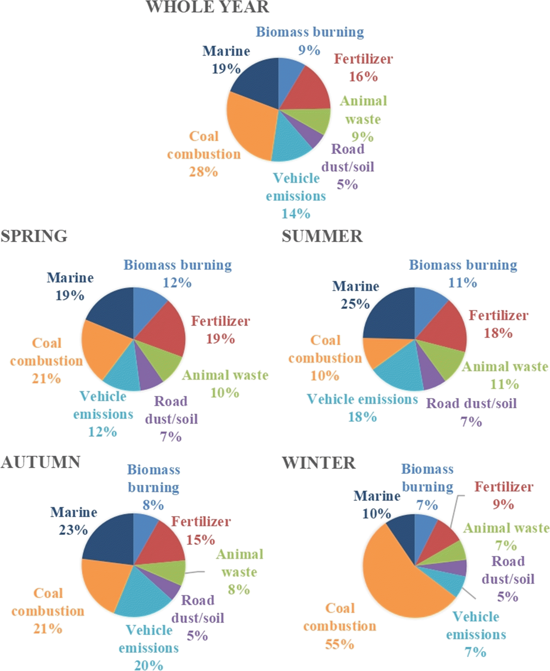 Annually, the dominant sources of inorganic nitrogen were coal combustion (29% ± 7%), marine (19% ± 15%), and fertilizer (16% ± 13%) (Figure 4). The highest proportion of coal burning in winter, the highest portion of marine source in summer, and the lowest proportion of fertilizer in winter were the three main characteristics of the seasonal sources of inorganic nitrogen isotopes. The primary source of Qianliyan inorganic nitrogen aerosols was coal combustion in winter (55% ± 6%), which acted in concert with the heating period. On the contrary, fertilizer accounted for the smallest proportion in winter (9% ± 8%), which acted in concert with the agricultural activity inactive period. Marine contribution was slightly raised to 25% ± 20% in summer but diminished to 10% ± 7% in winter, which is consistent with the dominant wind direction controlled by the East Asian monsoon.