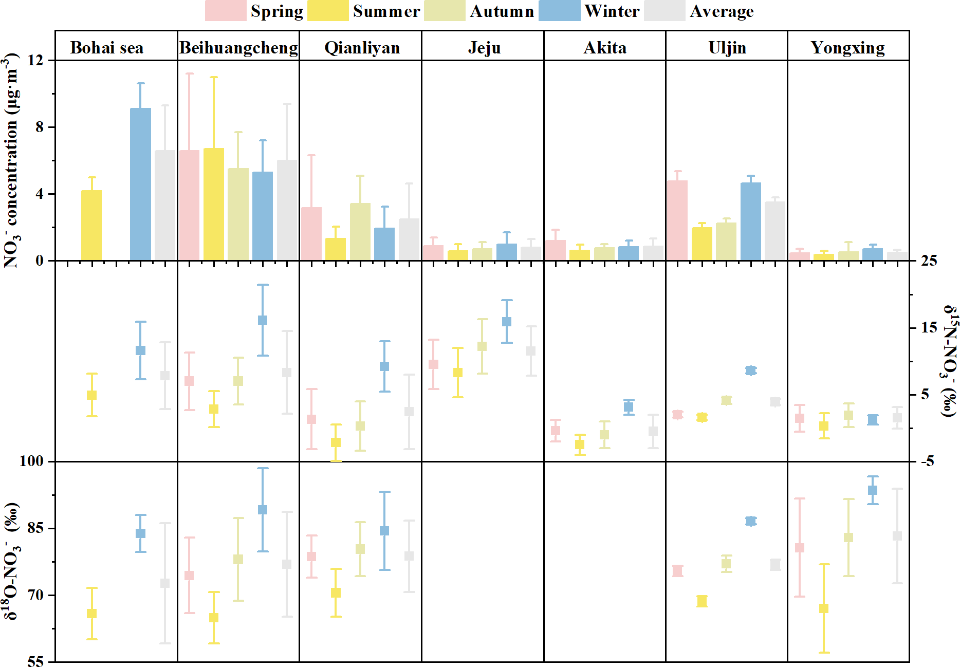 The seasonal and annual average ( ± SD) of nitrate concentrations (μg·m−3) and nitrogen and oxygen isotopic compositions (‰) of nitrate over the marginal seas of China and the East/Japan sea. Data source: the Bohai Sea (Zong et al., 2022), Beihuangcheng (Zong et al., 2017), Jeju (Kundu et al., 2010), Akita (Kawashima, 2019), Uljin (Kim et al., 2019), and Yongxing (Xiao et al., 2015).