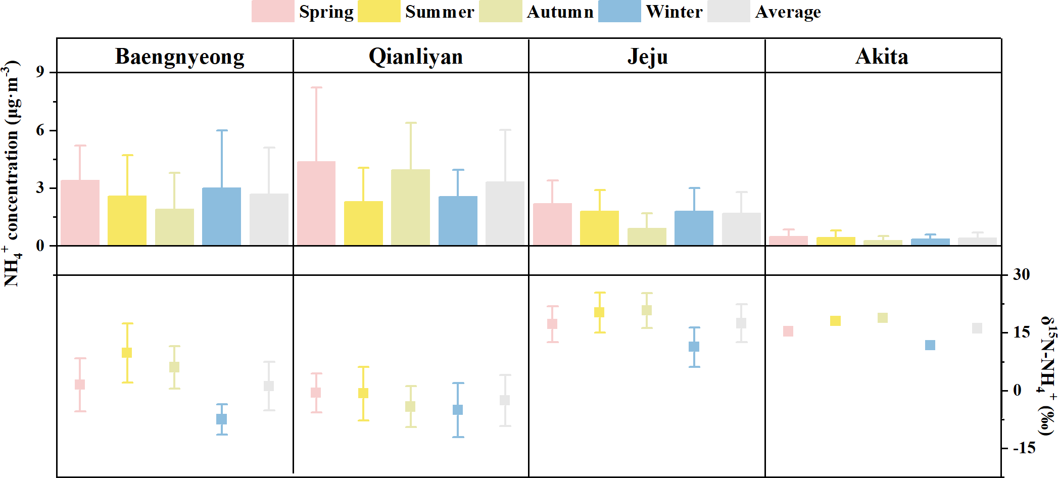 Unlike δ15N-NO3−, Qianliyan aerosol ammonium δ15N-NH4+ had no obvious significant correlation with meteorological parameters (Table S2). Although the seasonal and different-orientation δ15N-NH4+ of Qianliyan aerosols were not significantly different, average δ15N-NH4+ of Qianliyan aerosols was slightly higher in summer and lower in winter like other coastal sites, Baengnyeong, Jeju, and Akita (Figure 6). Additionally, it was also observed that the patterns of δ15N-NH4+ are higher in summer and lower in winter in aerosols over land (Park et al., 2018; Wu et al., 2019b; Dong et al., 2022). The average δ15N-NH4+ difference in aerosols between summer and winter was low to 0.3‰ in Seoul, Korea (Park et al., 2018), and up to 36.6‰ in Tianjin, China (Dong et al., 2022). These observational results indicate that there might exist accordant reasons for the ammonium isotope seasonality difference, regardless of the values of NH4+ concentration and δ15N-NH4+ in different sites and the differences of δ15N-NH4+ in summer and winter being different.