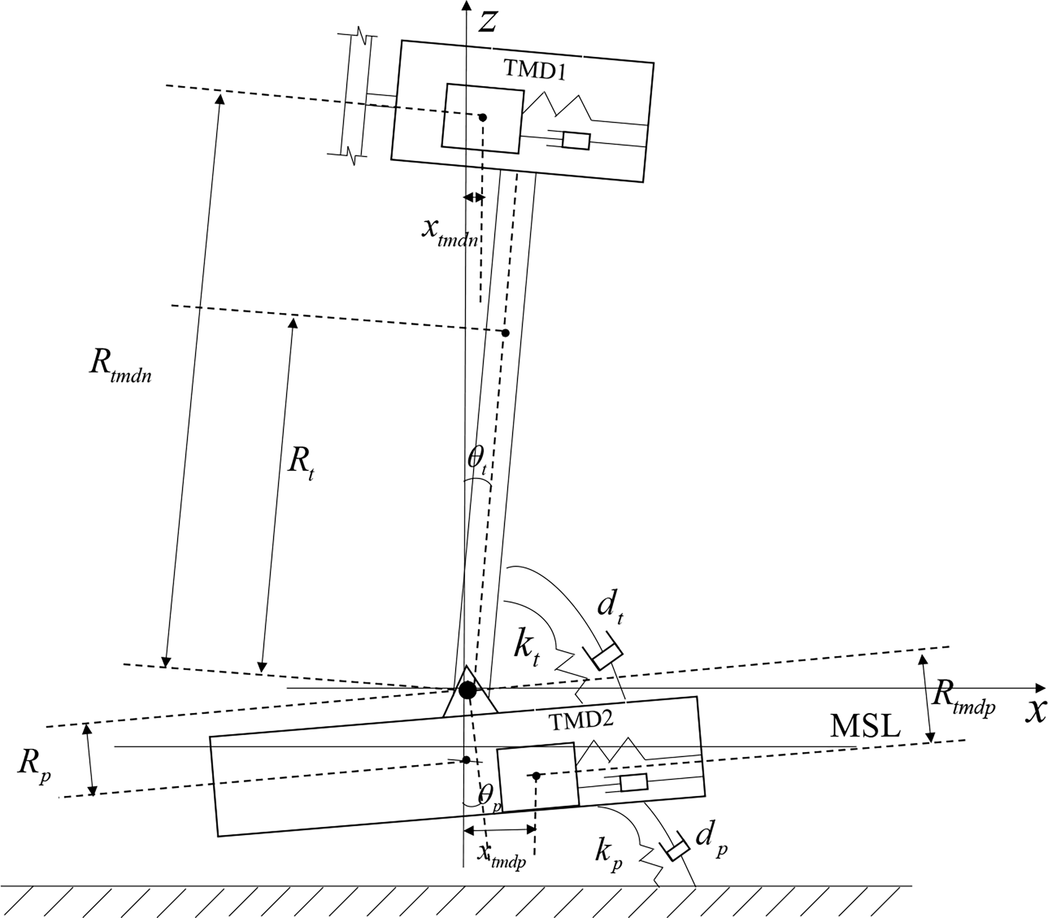 where m indicates the mass of each component of the simplified dynamic system, such as the tower, platform, and TMDs; I indicates the moment of inertia about the mass center of each component, and k symbolizes the equivalent spring stiffness; R indicates the distance between the mass center of each component and the hinged bearing; d denotes the equivalent damping.