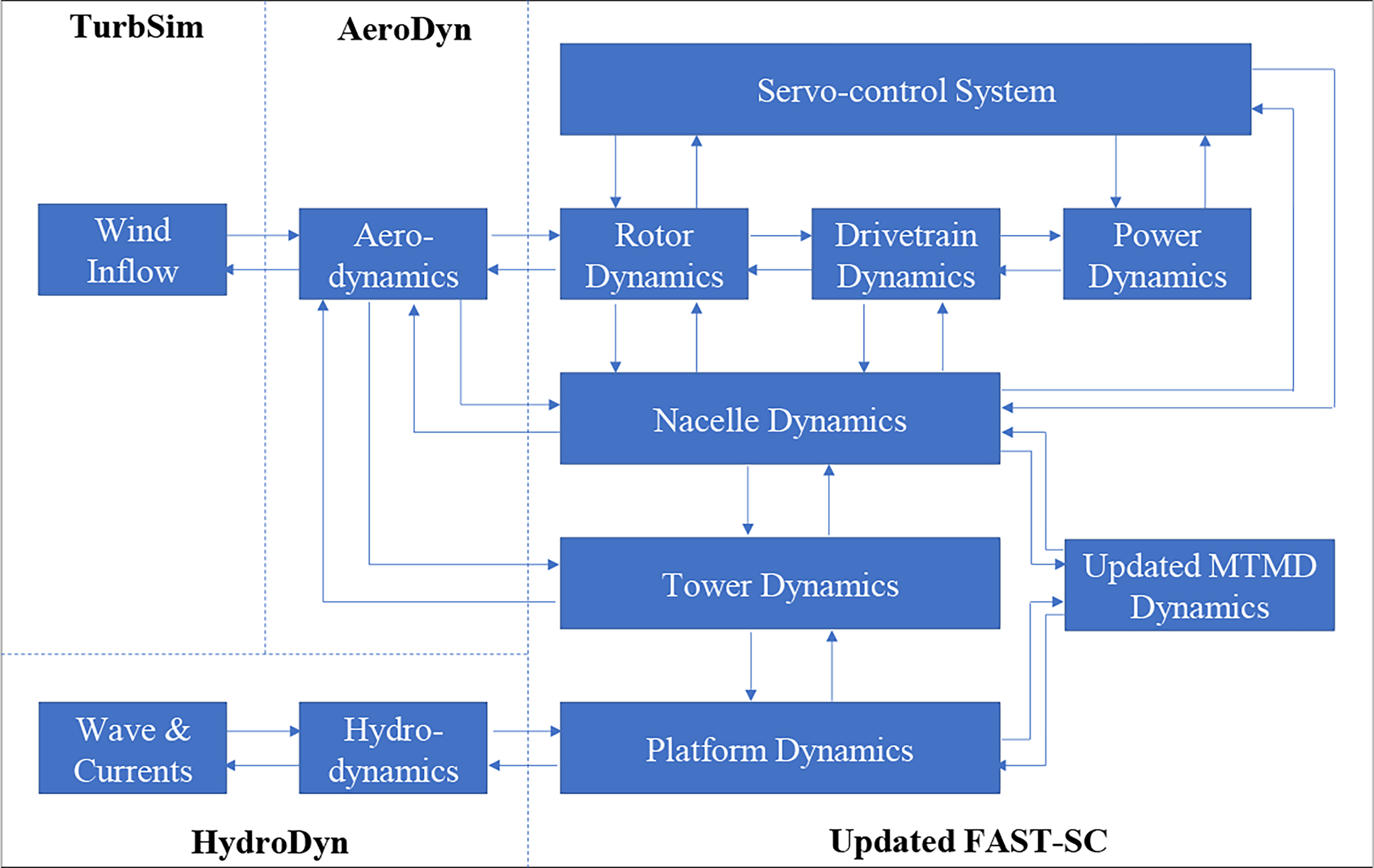 Schematic of the fully coupled model of FOWT with MTMD in the updated FAST-SC.