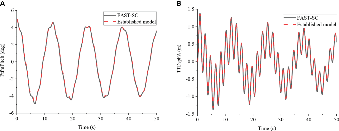 Time domain free decay responses of 10 deg initial platform pitch angle with MTMD between the parameter estimation model and updated FAST-SC model. (A) Platform pitch angle; (B) Tower-top displacement.