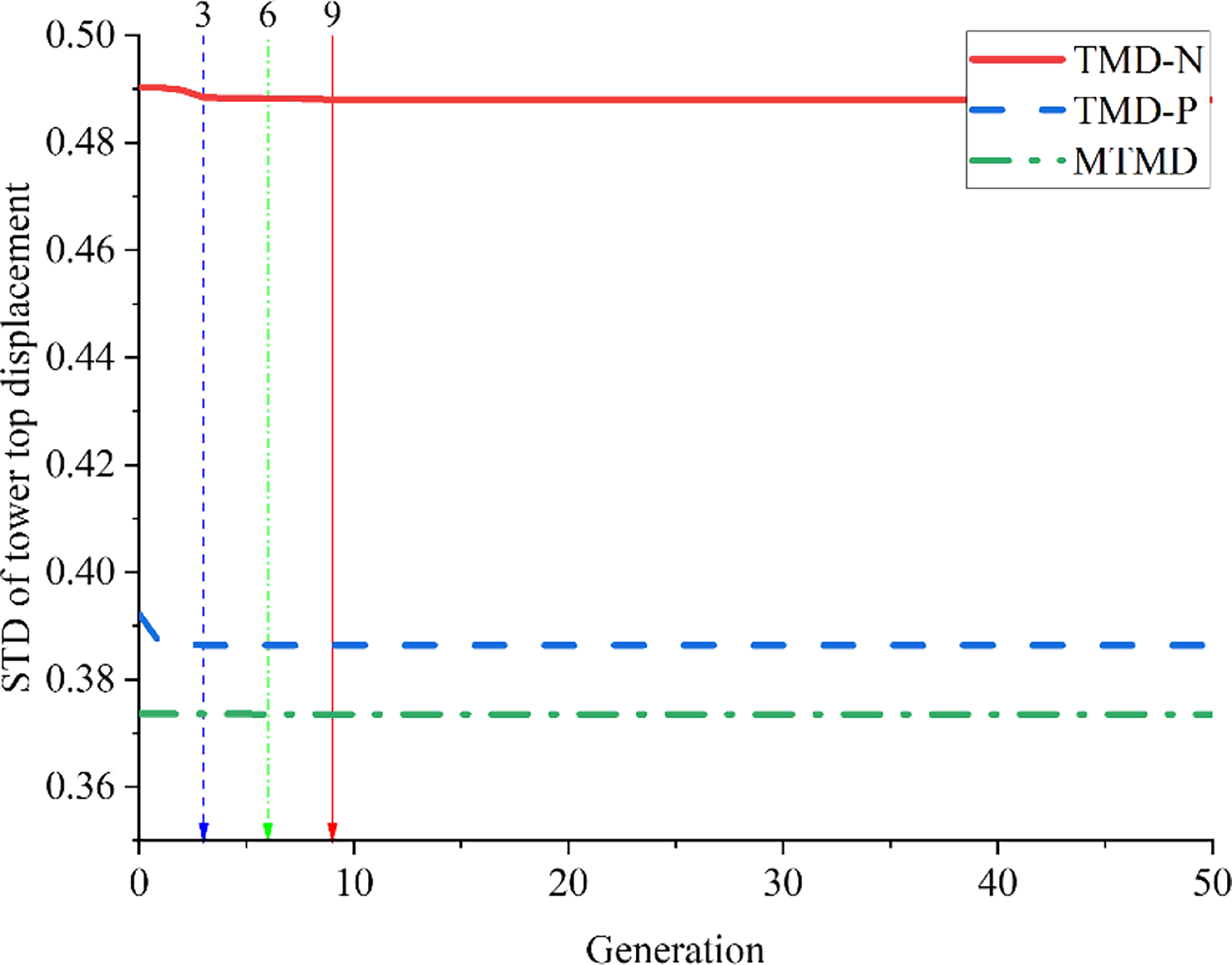 In this study, a genetic algorithm (GA) is selected as the global optimization method to optimize the MTMD stiffness and damping parameters. It is an evolution-inspired algorithm that involves the mathematical representations of populations, individual fitness, mutation, and even mating to search for an optimum for a predefined problem. Based on the established simplified dynamic model, an initial 5° platform pitch angle was applied to implement TMD and MTMD parameter optimization, and the STD of the tower top displacement was defined as the fitness function. The probability of the roulette wheel uniform crossover and mutation in the GA are designated as 0.6 and 0.01, respectively. The individual population size was set to 100 and the maximum generation was restricted to 50.