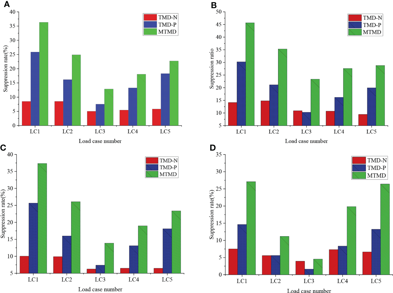 Existing approaches for the load mitigation of FOWTs can be categorized into active mechanical control and passive structural vibration reduction methods. In relation to the former approach, Larsen (Larsen and Hanson, 2007) suggested that the first natural frequency of the local pitch controller must be less than the fundamental frequency of the related OWT support system to alleviate the negative damping effects of the pitch controller on FOWT motions. An improved collective pitch control strategy (CPC) comprising a tower-top feedback loop, active pitch-to-stall regulation, and detuned controller gains was proposed by Jonkman (2008), and the improved structural responses of a barge FOWT were examined. Furthermore, increased blade root fatigue loads and fluctuating output also represent important problems. As a prominent characteristic of FOWTs, substantial asymmetric aerodynamic loads impair the control effects of the servo system and the stability of the integrated structure (Njiri and Soeffker, 2016); therefore, Namik (Namik and Stol, 2011) and Mohammadi (Mohammadi et al., 2018) developed an independent pitch control strategy (IPC) to compensate for such deficiencies. The coupling effects between the environmental loads, blade pitch control system and FOWT structural motions have been proven in the studies of Bredmoseh (Bredmose et al., 2017) and Goupee (Goupee et al., 2017); therefore, a multi-signal input and output system for blade pitch control regulations in FOWTs was recommended by Racch (Raach et al., 2014) and Wakui (Wakui et al., 2017) to balance the steady generator output and floating support system motions. Although various improved mechanical control strategies have been proposed to enhance the performance of FOWTs, the increased fatigue loads of rotor blades and the use of mechanical controllers, particularly for more complicated mechanical systems, have not been adequately investigated. Moreover, the positive effects of mechanical systems are limited under extreme winds and waves because such cases are beyond the regulation capacities of FOWT servo systems. Therefore, additional passive structural vibration control methods are applied to mitigate the FOWT responses under complex environmental conditions.