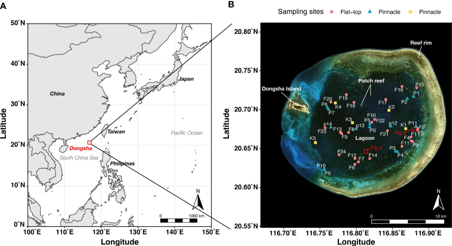 Atolls are annular mid-ocean reefs. They typically comprise various topographical features, such as spurs and groves, reef crests, and backreef flats. The reef rim of an atoll encloses a central lagoon and lagoonal patch reefs therein (Goldberg, 2016). Stony corals grow in these habitats, and reefs are shaped by different environmental factors in their respective habitats. For example, mechanical or physical erosion is an obvious force shaping spurs and grooves in shallow forereefs (Duce et al., 2014); however, such a force is substantially diminished in atoll lagoons. Charles Darwin’s (Darwin, 1842) subsidence hypothesis of atoll formation; that is, an atoll is formed by a volcanic eruption to the sea surface and the later subsidence and immersion of the resulting volcanic island, was supported by the discovery of old reef strata >1000 m in depth at the base of a Pacific atoll (Davis, 1928). However, the geological history of atolls is more complex than that envisioned by Darwin (Dickinson, 2009; Droxler and Jorry, 2021). The fluctuation of seawater levels since the last glacial maximum has presumably shaped atoll reefs (Grigg et al., 2002; Siddall et al., 2003; Woodroffe and Horton, 2005), too. During the Holocene, as sea levels rose to near current levels, environmental factors such as wind, waves, water temperature, sea level, and current have been highly variable within an atoll. The dynamics of reef formation can thus differ substantially at the local scale (Mazzullo et al., 1992; Purdy and Gischler, 2005). Because forereefs are exposed to strong waves, they may be highly dynamic; the processes of skeletal deposition and erosion compete with each other within forereefs (Hennige et al., 2017). By contrast, reefs may easily grow and accumulate in lagoons, which are protected from waves by reef crests and reef rims (Brown and Dunne, 1980; Wang and Hung, 2009). Atolls developed on a continental shelf, edge, or slope are commonly considered to differ considerable from other types of atolls (Woodroffe and Biribo, 2011). Three types of atolls have been identified in the South China Sea: ocean, shelf, and slope atolls (Guozhong, 1998). Dongsha Atoll (Figure 1) is a shelf atoll in the northern South China Sea (Tomascik et al., 1997).