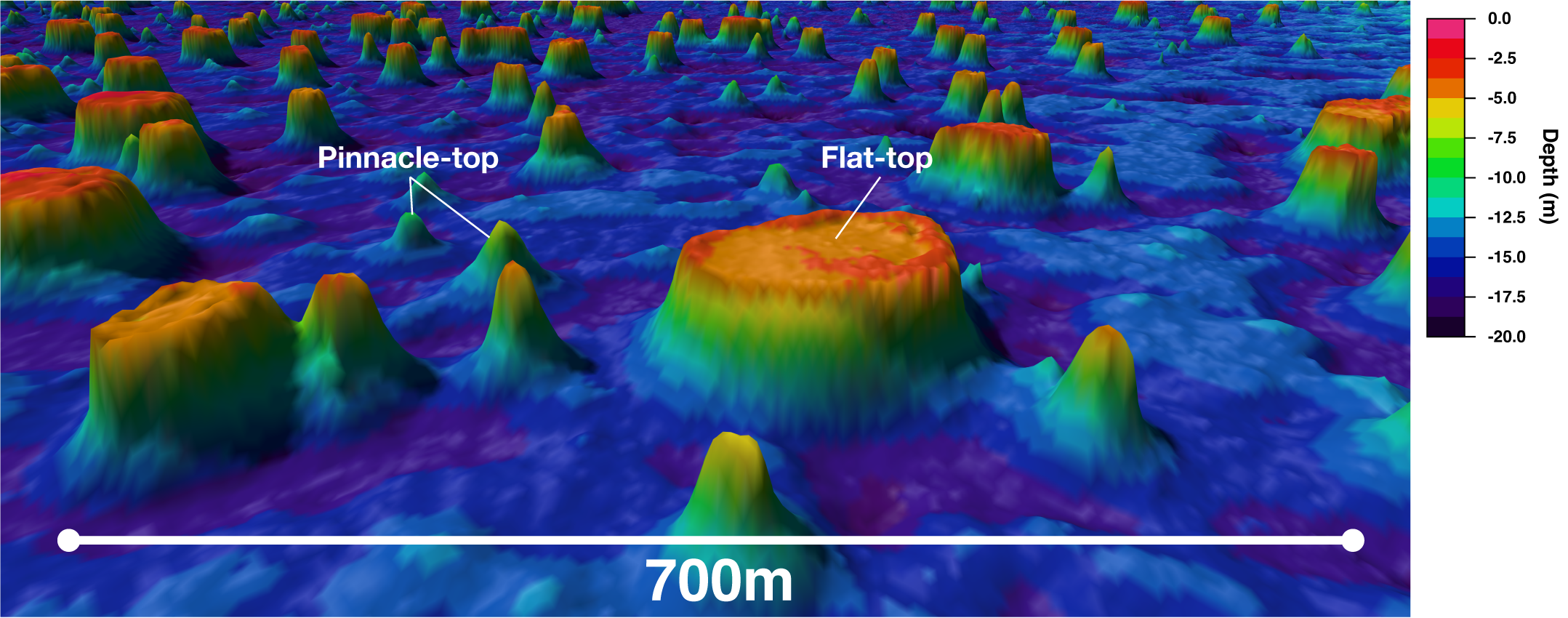 The working definition of the distinction between flat-top and pinnacle-top patch reefs was that the surfaces of flat-top patch reefs must have diameters of >5 m (Brock et al., 2008).