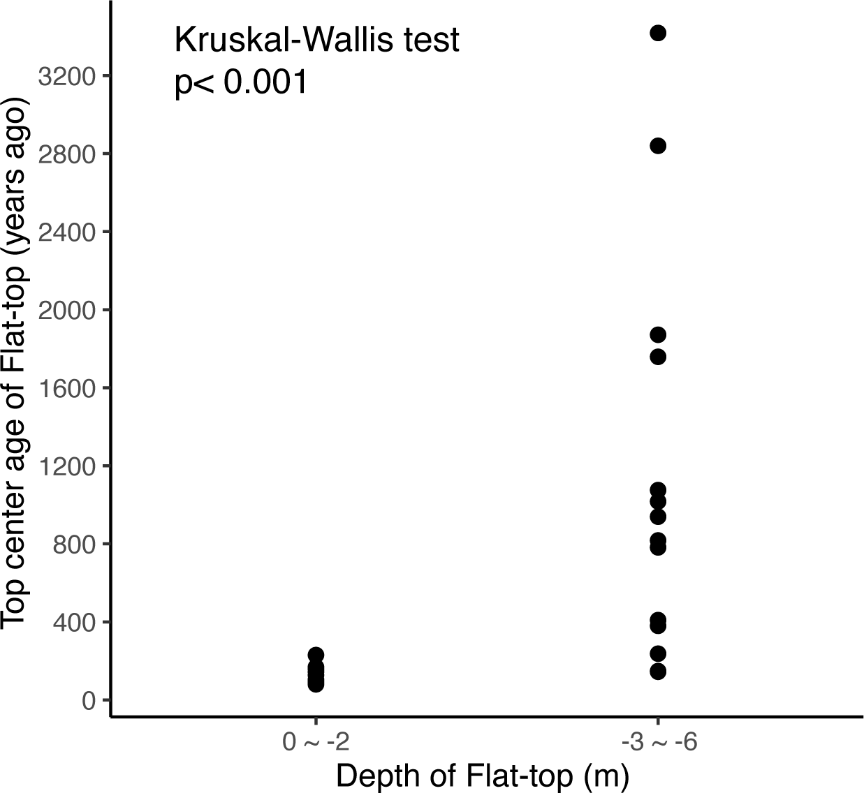 Comparison of the ages of the centers of surfaces of flat-top patch reefs with different depths. The 24 core samples collected from the centers of the surfaces of the flat-top patch reefs (F1–F24) were divided into two groups: 0 to −2 m (n = 9) and −3 to −6 m (n = 15). A nonparametric Kruskal–Wallis test revealed a significant difference in center age between the two groups.