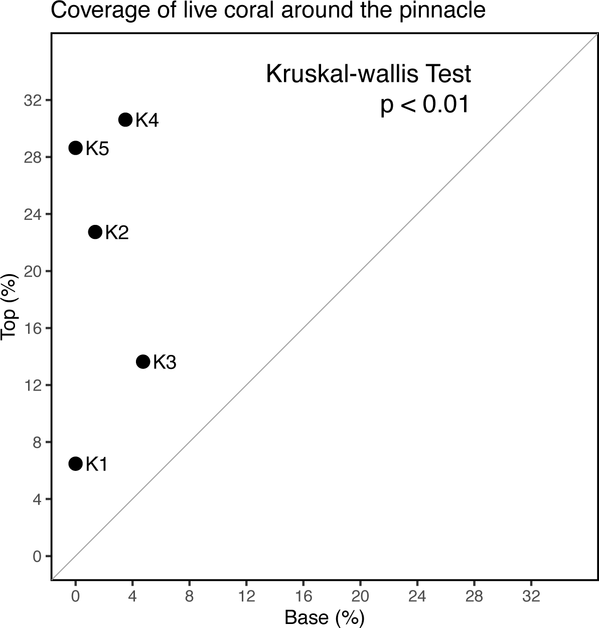 Comparison of live coral cover on the tops and bases of pinnacle-top patch reefs in the Dongsha Atoll lagoon. The living coral cover on the tops of the pinnacle-top patch reefs was significantly higher than that on the bases.