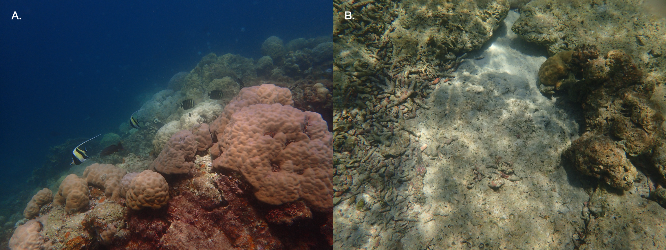 Images of flat-top patch reefs. (A) Colonies of massive coral Porites on the edges of flat-top patch reefs in the Dongsha Atoll lagoon. (B) Lack of corals in the central part of a flat-top patch reef.