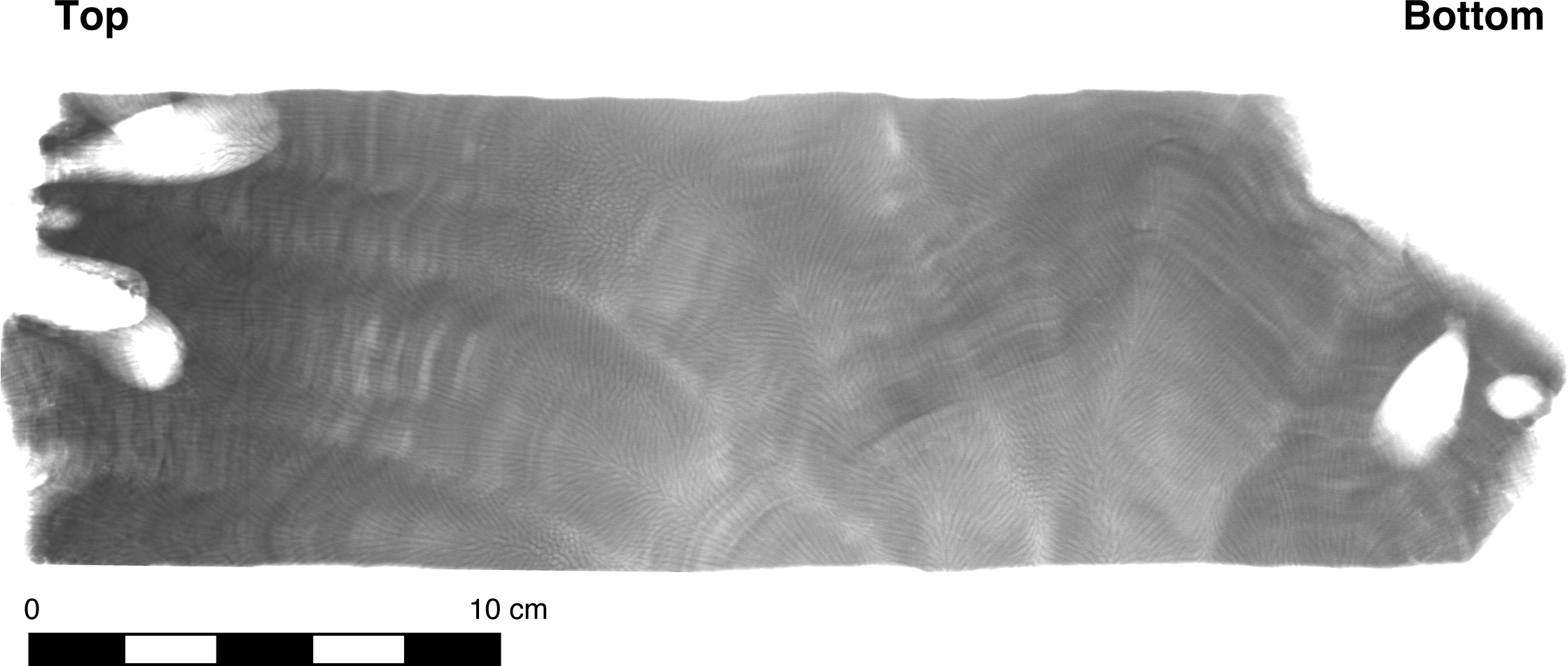 X-ray slice image of a core sample. Core sample was from the surface of the center of a flat-top patch reef (F12-2). It was collected using a hydraulic drill with a diameter of 10 cm and a core length of 30 cm. The average age of the specimens collected from the sides of the core approximately 5 cm from the surface was 3489.2 ± 16.6 years.