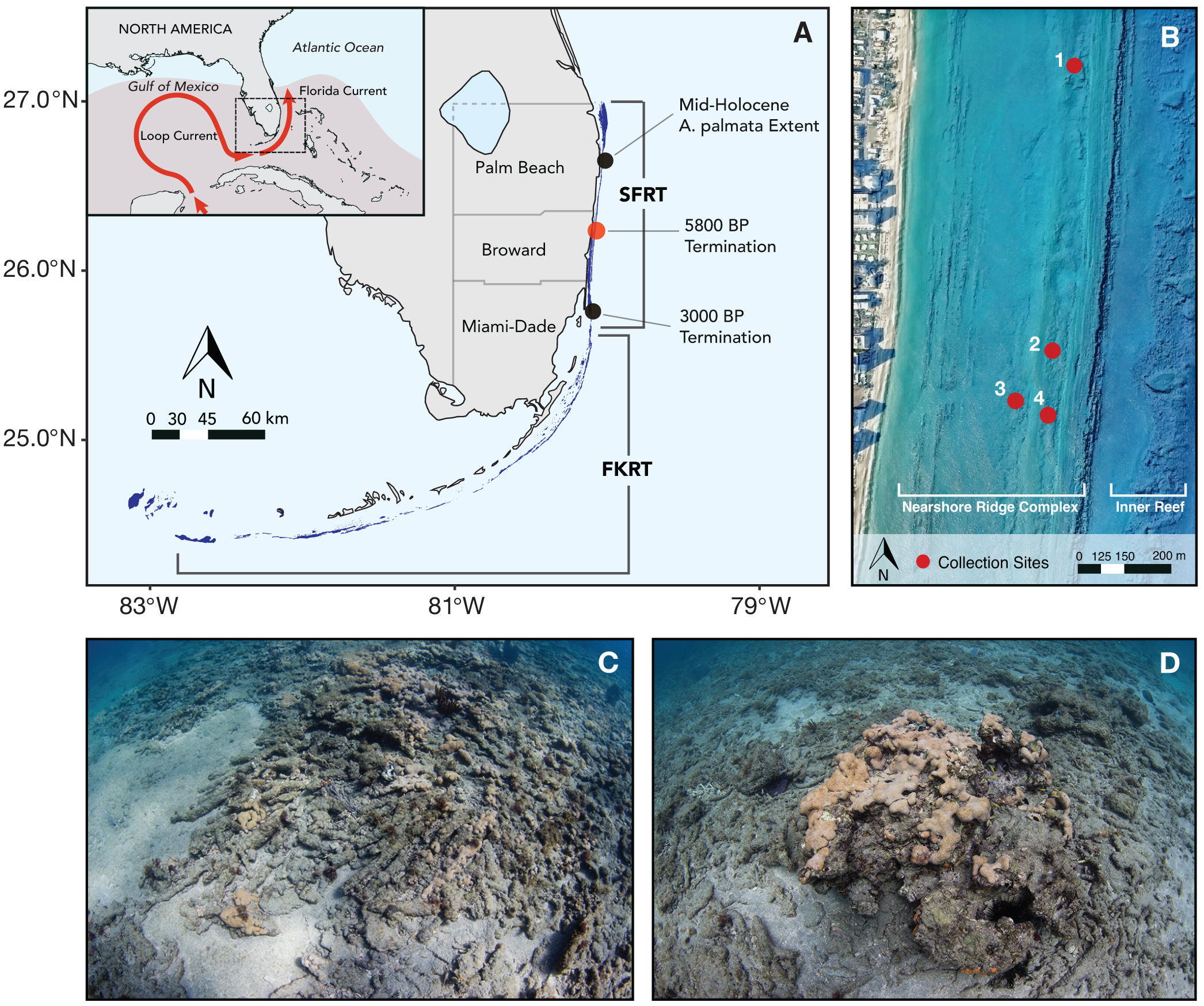 Figure 1 Description of the study area in relation to the broader biogeographical setting of the Florida reef tract. (A) Location of study area (red dot) on Southeast Florida reef tract (SFRT) extent, the full extent of which is shown by the dark blue polygon. Inset map shows main currents affecting the region. Estimated maximum Atlantic Warm Pool extent in fall (defined as sea surface temperatures (SSTs) warmer than 28.5° [Wang et al., 2008]) is shaded in red. (B) Map of study area with sampling sites marked in red. Map was made by overlaying 1-m resolution lidar bathymetry and 1-m resolution aerial imagery. Bathymetric map was generated with digital elevation models acquired by U.S. Army Corp of Engineers in 2017. Aerial imagery was collected by PhotoScience, Inc. on March 8, 2013. (C) Interlocked sub-fossil Acropora palmata coral branches overlying antecedent coquinoid limestone surface. (D) Sub-fossil Orbicella spp. coral colony (~1.5 m diameter) surrounded by unconsolidated Acropora-dominated coral rubble and smaller branching coral rubble. Photos by A.B.M.