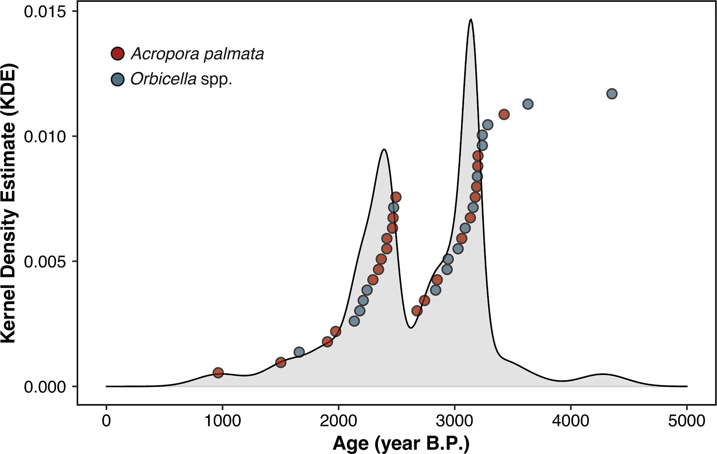 Figure 2 Kernel Density Estimate distribution curve produced from the U-Th age data [in years before present (BP)] obtained from subfossil Acropora palmata and Orbicella spp. coral skeletons (see Supplementary material for more details). Individual U-Th ages are shown as points.