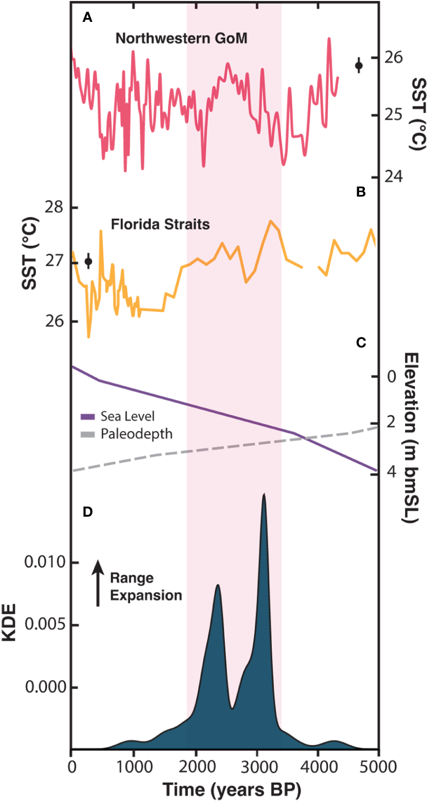 Figure 3 Comparison between late Holocene reef growth on the nearshore ridge complex (NRC) off southeast Florida, sea level, and sea-surface temperature (SST) variability in the subtropical western Atlantic. SST reconstructions from (A) the Garrison Basin in northwestern Gulf of Mexico (GoM) [Thirumalai et al., 2021] and (B) the Florida Straits (SST composite created from records near the Dry Tortugas [Lund and Curry, 2004] by Thirumalai et al., 2021). Modern observations of mean-annual SST at each location are indicated by black dot with error bars (error bars indicate standard deviation over 1970—2010 CE; SST was taken from HadISST, Rayner et al., 2003). (C) Estimated late Holocene relative sea level from Khan et al., 2017 and calculated paleo-water depths (see Supplementary material). (D) Kernel Density estimate (KDE) distribution of the 40 U-Th ages obtained from Acropora palmata and Orbicella spp. samples at study site. Pink shaded bar shows relative warming in both records and overlap with reef growth.