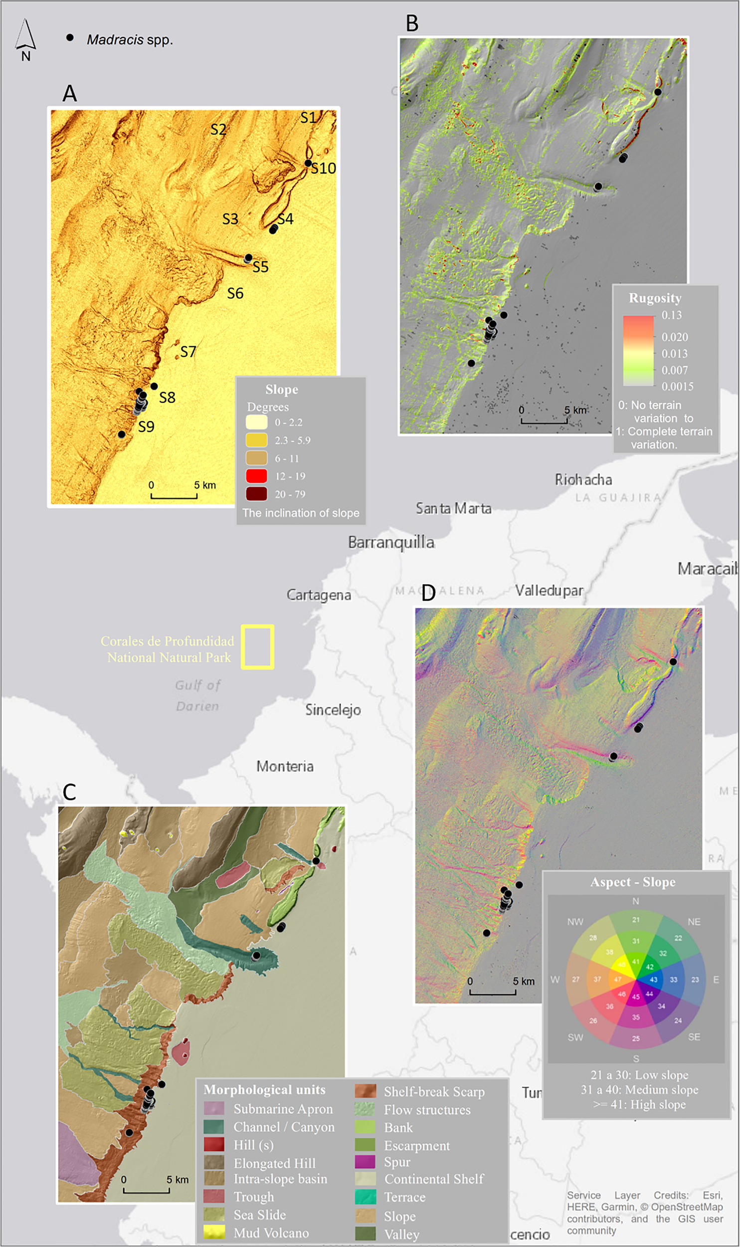 Study areas and sectors (S) where video transects were carried out; black dots are the location of Madracis spp. coral patch occurrences obtained from the analysis of the ROV video transects. (A) Slope map. (B) Rugosity. (C) Morphological units. (D) Aspect map. The background image shows the area of the Corales de Profundidad National Natural Park in the Colombian Caribbean. ROV, remotely operated vehicle.