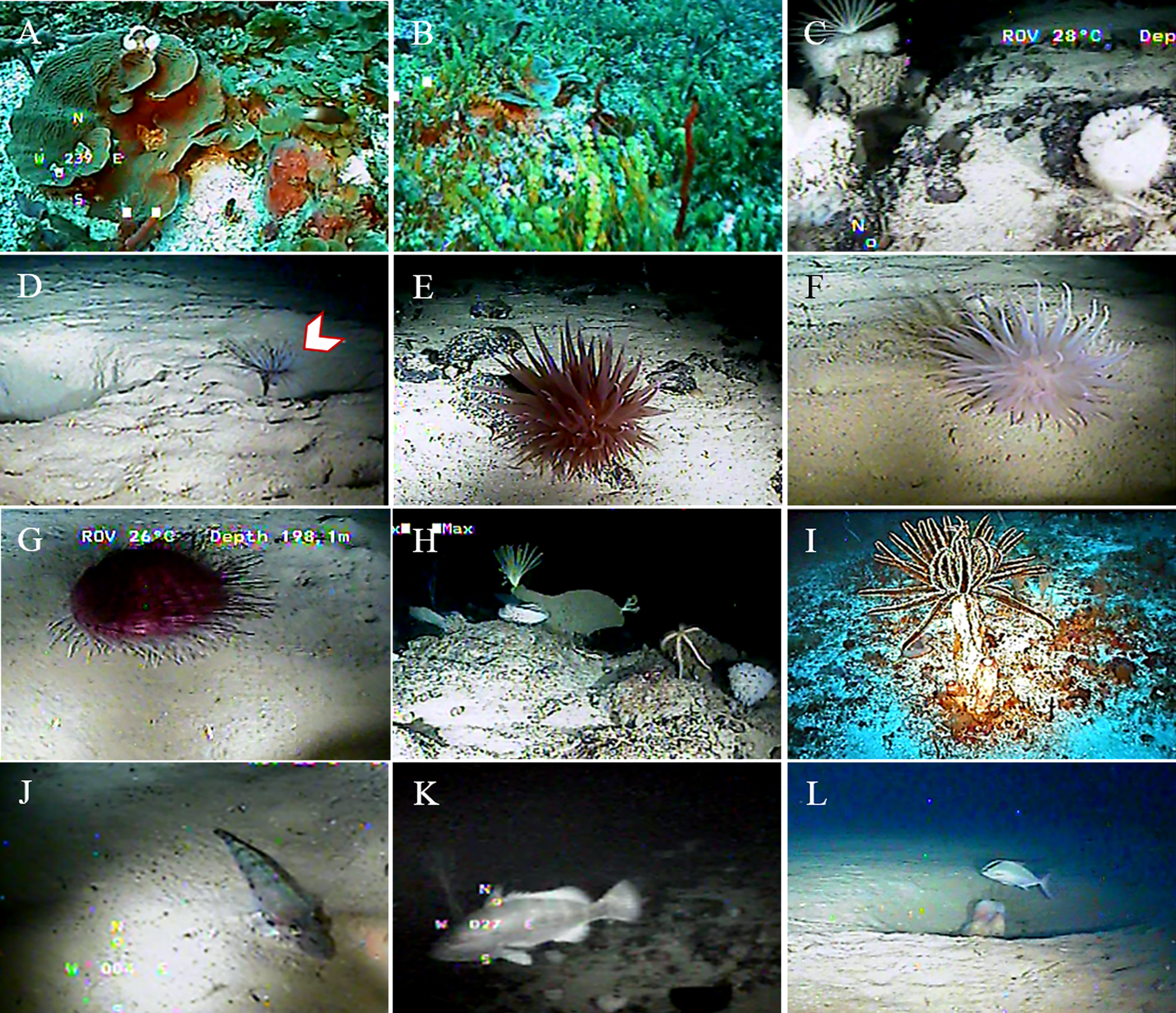 Example of the fauna found in the Corales de Profundidad National Natural Park (CPNNP). (A)Agaricia sp.; Lobophora variegata and Stegastes partitus. (B)Halimeda copiosa. (C) Glass sponges and Comatulida spp. 2. (D)Ceriantheopsis sp. (E, F)Liponema spp. (G)Araeosoma cf. fenestratum. (H) Comatulida spp. 2 and Ophiacanthida sp. (I)Nemaster grandis. (J) Percophidae, Bembrops sp. (K)Epinephelus sp. (L)Seriola rivoliana.
