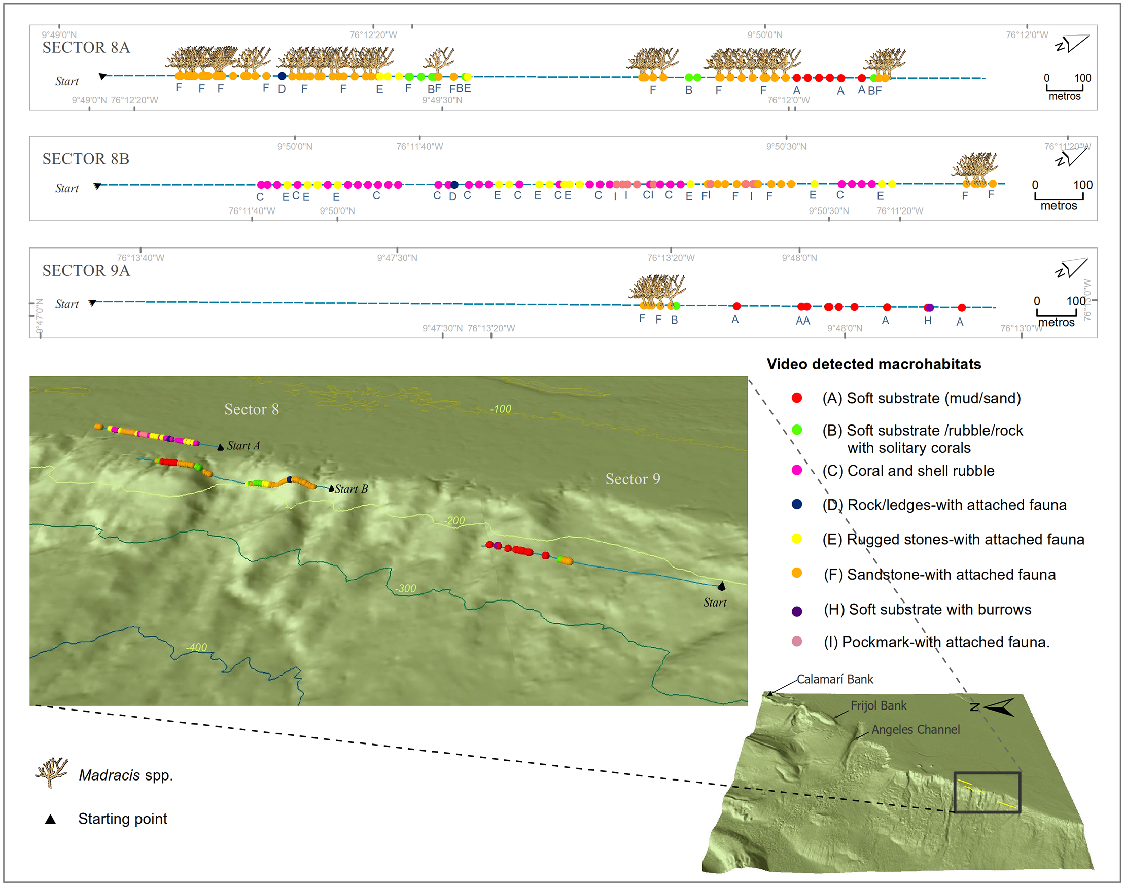 ROV linear video transects were made at each sector, in water depths between 46 and 354 m, to characterize qualitatively the benthic macrohabitats and their associated macrobiota and fishes. The equipment had a front camera (¼″ CCD 380 I TV-lines, 0.1 Lux/F = 1.2) pointed ~30° to view near the bottom and far the horizon, with 10 cm parallel lasers for scale. Positioning was estimated using an underwater acoustic positioning method like an ultra-short baseline (USBL) mounted on the vehicle, which gave a geographic position every 30 s approximately. In each sector, ROV dives ranged from 1 to 4 h in length, covering approximately length 1 km (0.54 nm), sometimes doubling the time when necessary depending on the benthic complexity. The ROV tracks (navigation data like coordinates and depth) were projected to UTM Zone 18N using the Geographic Information System ArcGIS 10.3.1 software.