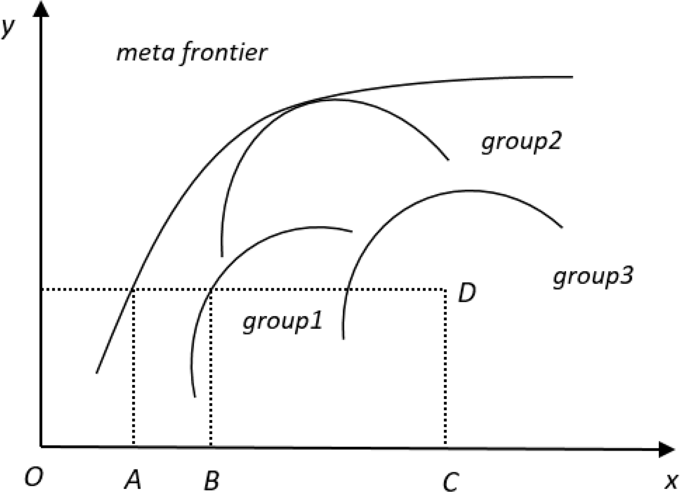 The meta-frontier framework (Battese and Rao, 2002; O’Donnell et al., 2008) enables the construction of group frontiers by grouping DMUs, which first constructs the same production frontier for all DMUs, called the meta-frontier, and then constructs the group frontier for each group of DMUs, called the group frontier. In addition, the two efficiency values of DMU reflect its actual production level under the group frontier and its potential production level under the meta-frontier, so by comparing the efficiency values of the DMUs in the two production frontiers, the gap between the actual and potential production levels can be known.