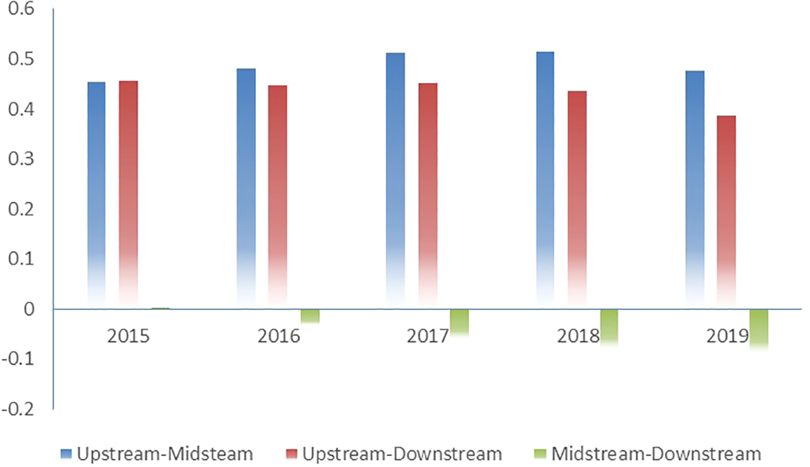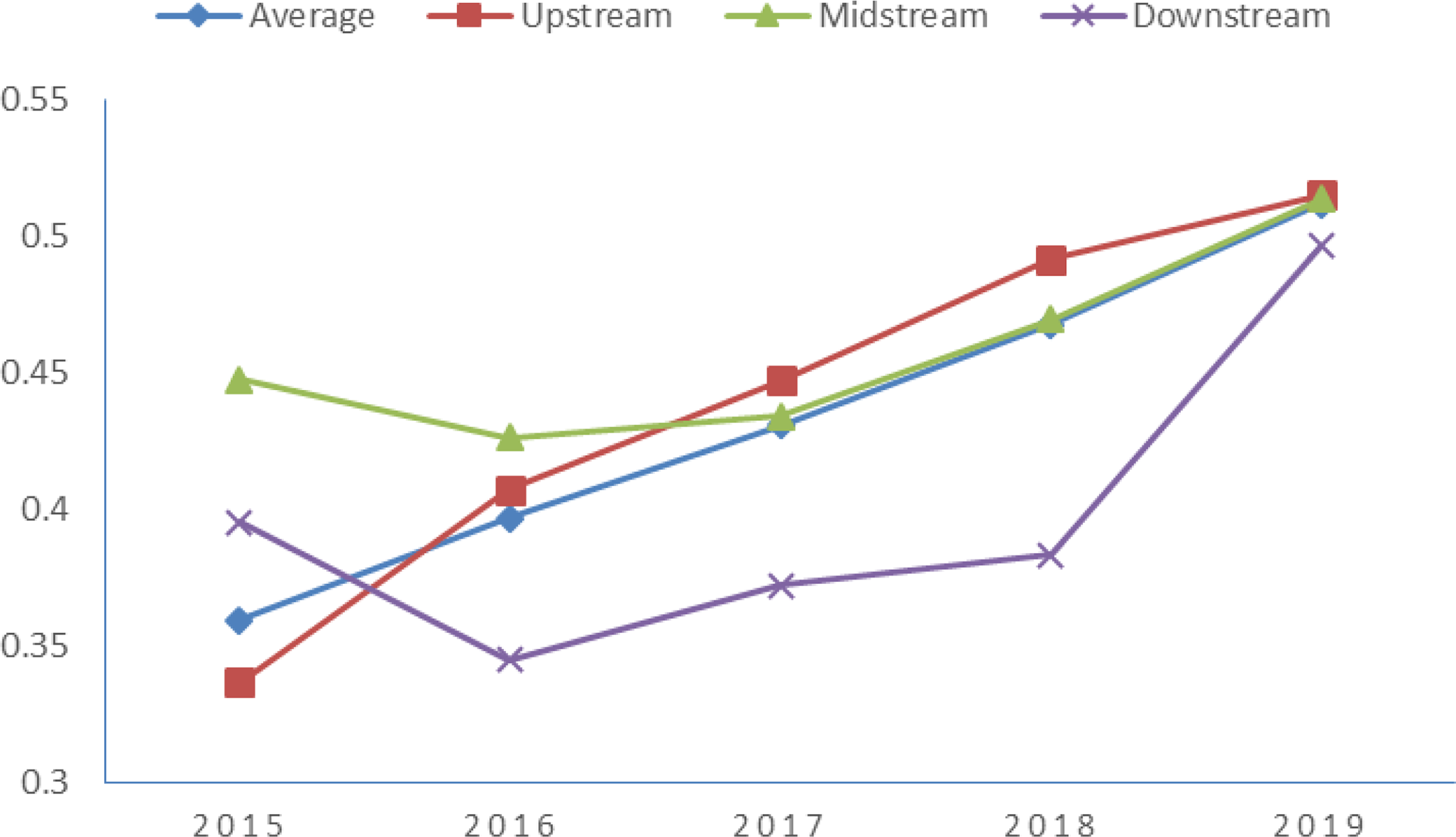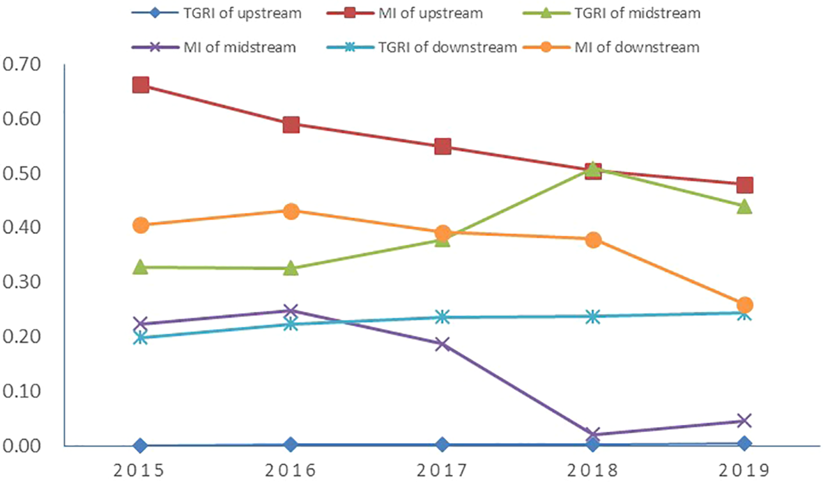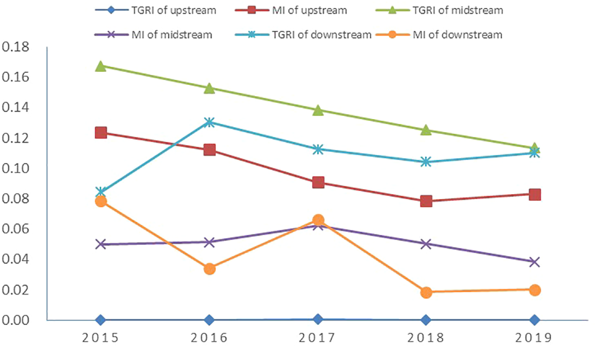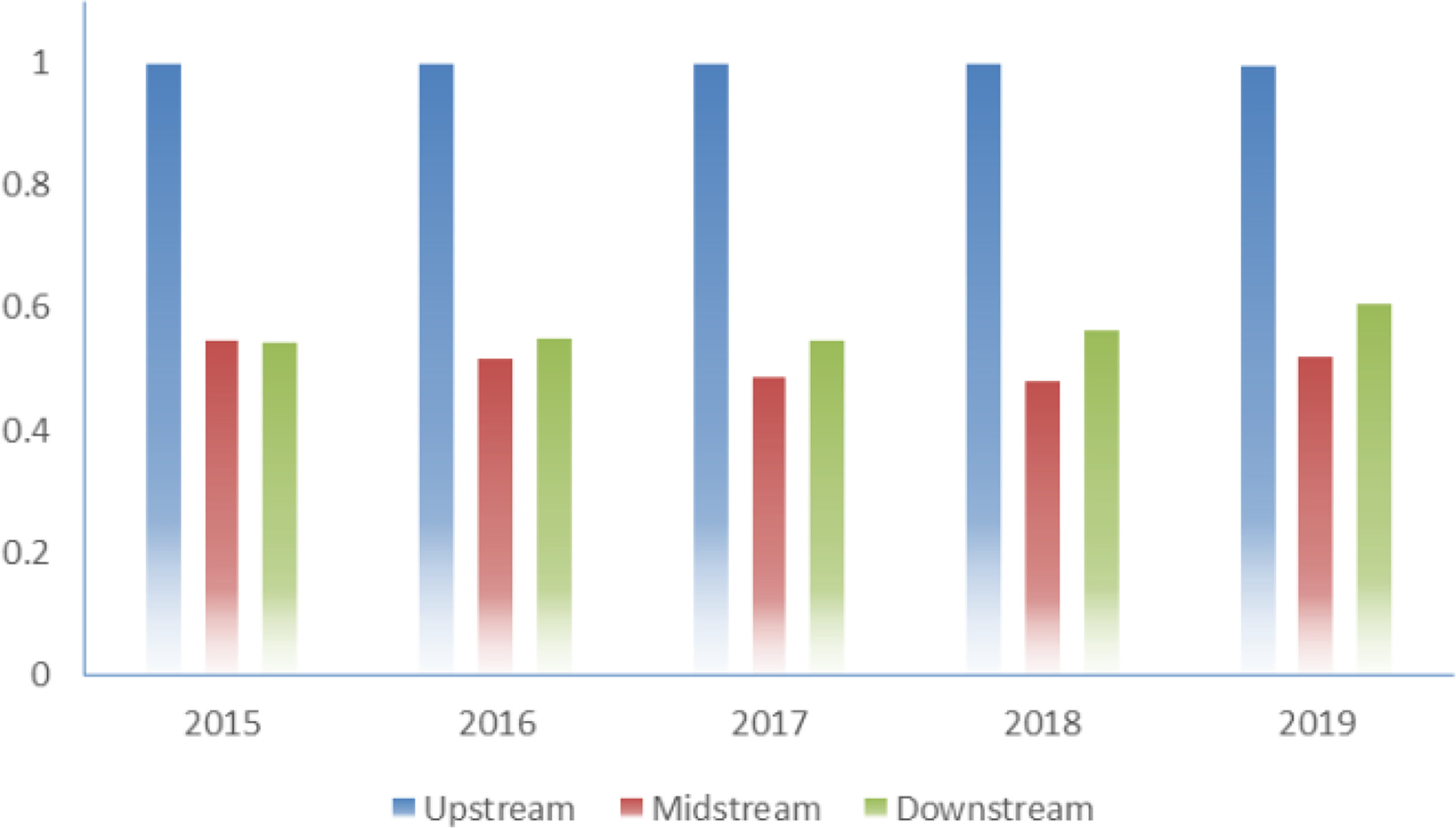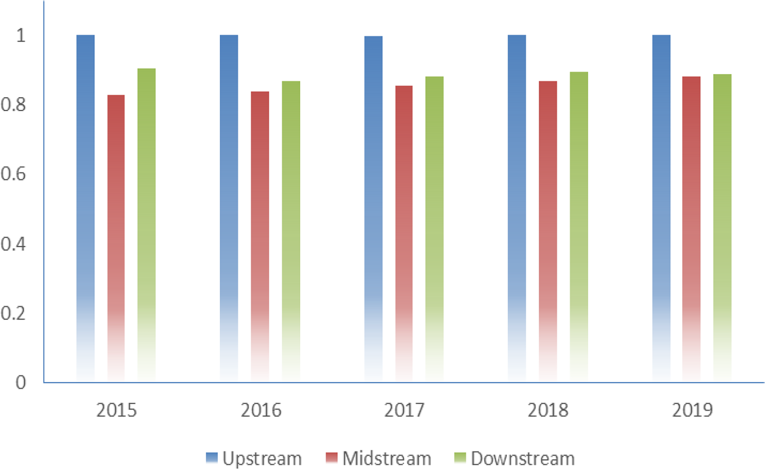 The gap between the MGTE of each link of the industry chain and the GGTE is further discussed by using the TGR, which reflects the gap between the actual green technical level and the potential green technical level, as shown in Figure 3. It can be seen that the overall TGR of the three links are relatively high, all above 0.8, which means the gap between the actual green technology level and the potential green technology level of each link is not very large. Specifically, the TGR of upstream is always 1, which is absolutely ahead of midstream and downstream. It indicates that the gap between the actual green development level and the potential green development level of the upstream is very small, and its technology level and management level are in the absolute leading position in the industry chain. The TGR of midstream and TGR of downstream are close and there is no significant increase trend between 2015 and 2019.
