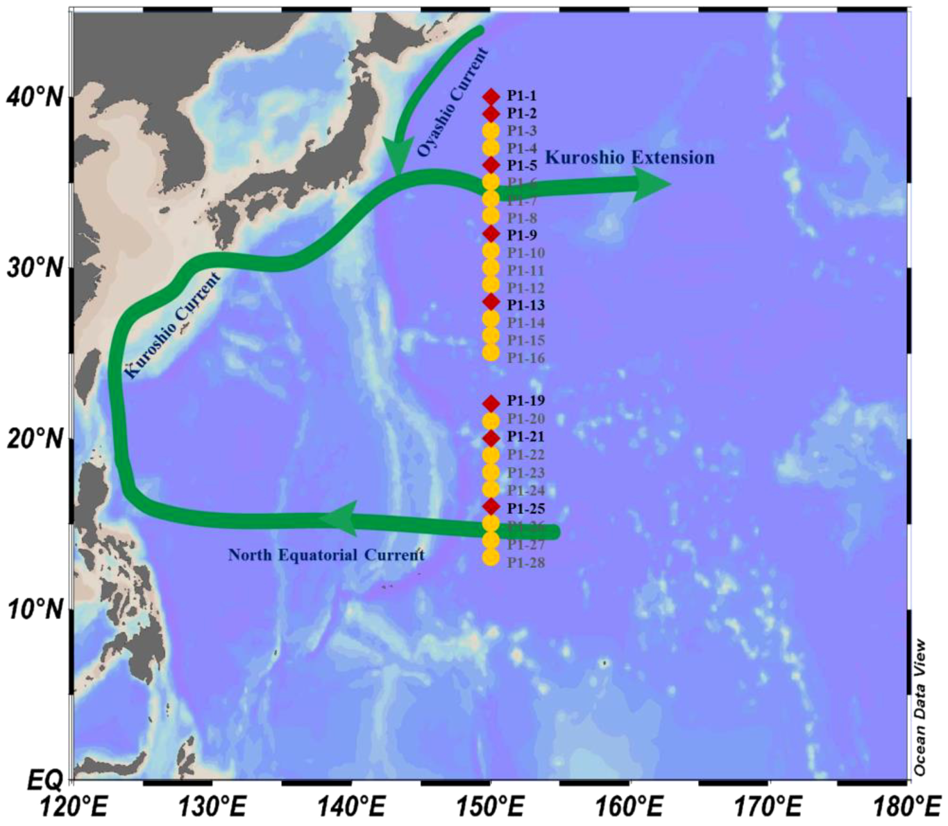 Map of the study region plotted using Ocean Data View (ODV, Schlitzer, 2015) and the sampling transect stations of line P1 in the northwestern North Pacific in November 2019. Red diamonds are the stations for measuring δ13C throughout the sampling water depth.