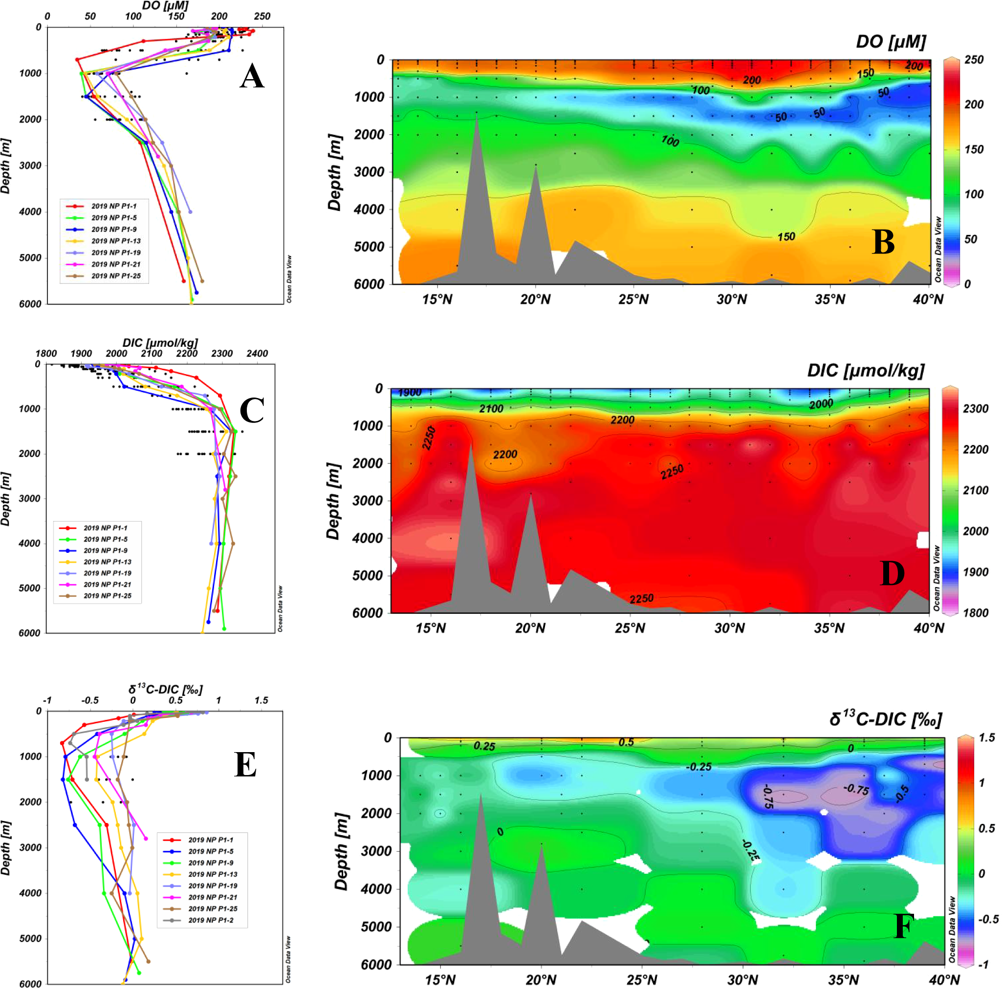 Depth profiles and latitudinal distributions of DO (A, B), DIC (C, D) and δ13C (E, F) in water samples collected from stations along the P1 transect in the northwestern NP in November 2019. Distribution of DO along the P1 transect is cited and replotted from Ge et al. (2022b). Data from the upper 2,000 m depth of the sampling stations are shown as black dots in the depth profiles.