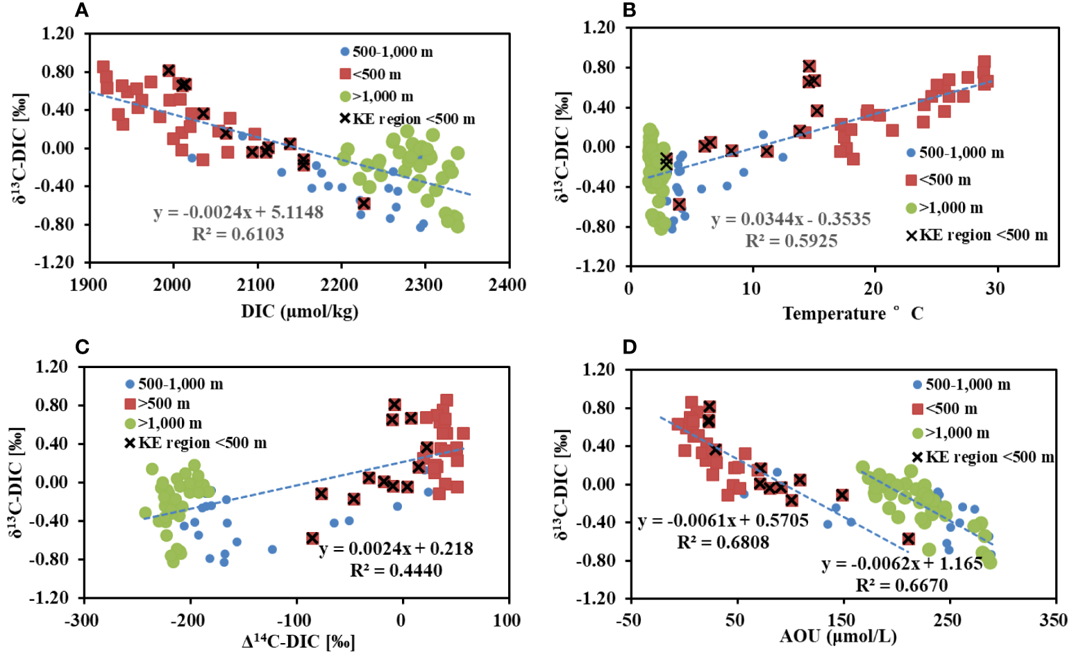We use the temperature, salinity, oxygen, DIC and Δ14C of DIC data to help explain these isotopic δ13C data. As shown in Figure 4A, the δ13C-DIC values had negative correlations with DIC concentrations (R2 = 0.61, p<0.001), i.e., lower 13C-DIC values were associated with higher DIC concentrations. Positive correlations for δ13C-DIC and water temperature in the upper 1,000 m depth (R2 = 0.59, p<0.001), as shown in Figure 4B, indicated that the values of δ13C-DIC decreased with depth. The DIC concentration and temperature showed the opposite trend, i.e., the deeper the water, the higher the DIC concentration. In the upper water, the influence of water temperature on δ13C-DIC could be primarily controlled by air-sea exchange as well as ocean circulation and mixing, but the photosynthesis and respiration of organic matter also affected the distribution of δ13C-DIC. Below 1,000 m, as plotted in Figure 4B, the values of δ13C-DIC may not be influenced by water temperature, as the water is cold and uniform below this depth. In deeper water, microbial degradation of organic matter with water circulation and mixing may play a key role in affecting δ13C-DIC. We used the AOU to infer the biological effects. As shown in Figures 4A, D, δ13C-DIC decreased rapidly with increasing AOU and increasing DIC. These correlations were due to photosynthesis in the surface water and the oxidation of organic matter depleted in 13C in the deep water. In the upper 500 m (R2 = 0.68, p<0.001; Figure 4D) and below 500 m (R2 = 0.67, p<0.001; Figure 4D), there were highly linear correlations existing between δ13C-DIC and AOU along the P1 transect. The slope of these two regression lines in the upper 500 m and below 500 m was similar, but the intercepts were different (Figure 4D). The variation in the intercepts may represent various sources and influences of water masses. By estimating the net annual air–sea CO2 flux using the sea–air pCO2 difference and the air–sea gas transfer rate, the Western NP Ocean was determined to be a sink of atmospheric CO2 (Takahashi et al., 2009), which could explain the negative shift in the intercept of the linear curve in the upper water comparing with that in deep water. In the upper 500 m, the penetration of CO2 through the air-sea interface and photosynthesis are the primary factors affecting the values of δ13C-DIC (Takahashi et al., 2000). In deeper water, the movement of different water masses and mixing as well as bathypelagic respiration of POC in the dark part of the ocean influence the distribution of isotopic DIC signatures in the western NP Ocean.
