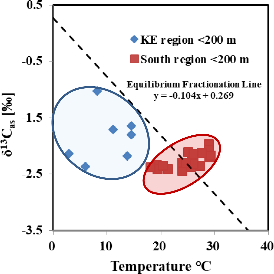 The δ13Cas versus temperature diagrams for water upper 200 m at subtropical gyre water Sea Water and Kuroshio-Oyashio Mixed Water Region. The dashed line is the equilibrium fractionation line when ocean DIC is in complete isotopic equilibrium with the atmosphere (Itou et al., 2003).