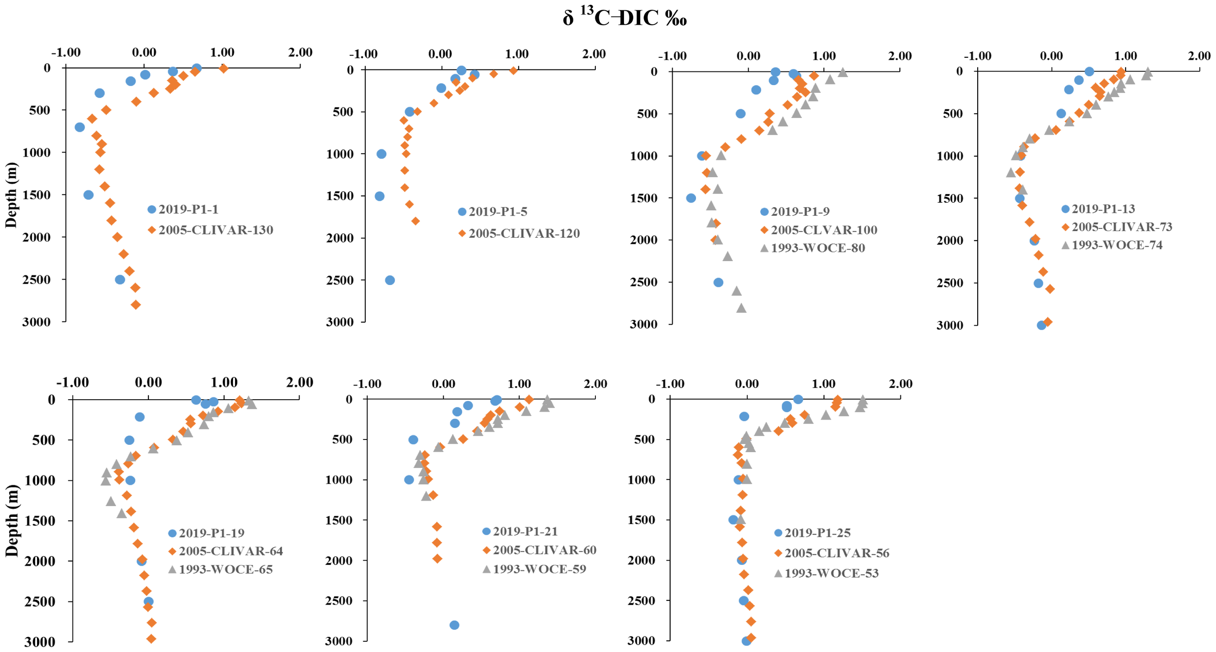 The values of δ13C-DIC in the upper water layers along the P1 transect decreased in the NP compared with observations of the nearby transect of P10 in 1993 and P10N transect in 2005 due to increased anthropogenic carbon penetration into the ocean. The values decreased at an average rate of 0.28‰ per decade from 1993 to 2019. This decrease was generally consistent with that calculated from the increase in anthropogenic CO2 input in the NP. The rate of decrease in δ13C-DIC from 2005 to 2019 was slightly faster than that between 1993 and 2005, which could suggest that air-sea exchange in the study area may have accelerated the absorption of anthropogenic CO2 in recent years.
