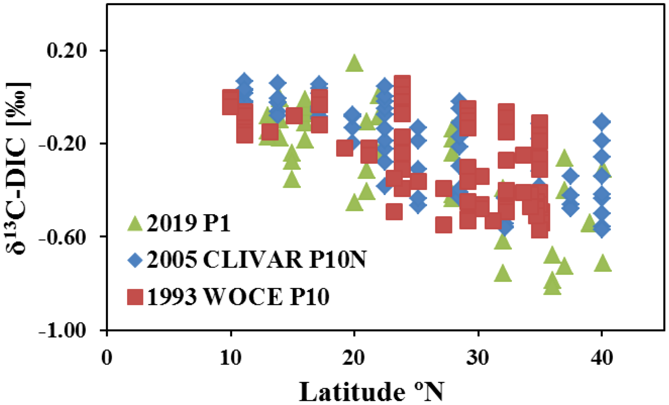 The δ13C-DIC values for samples between 1,000 and 3,000 m depths as a function of latitude (10°N–40°N) from 1993, 2005 and 2019.