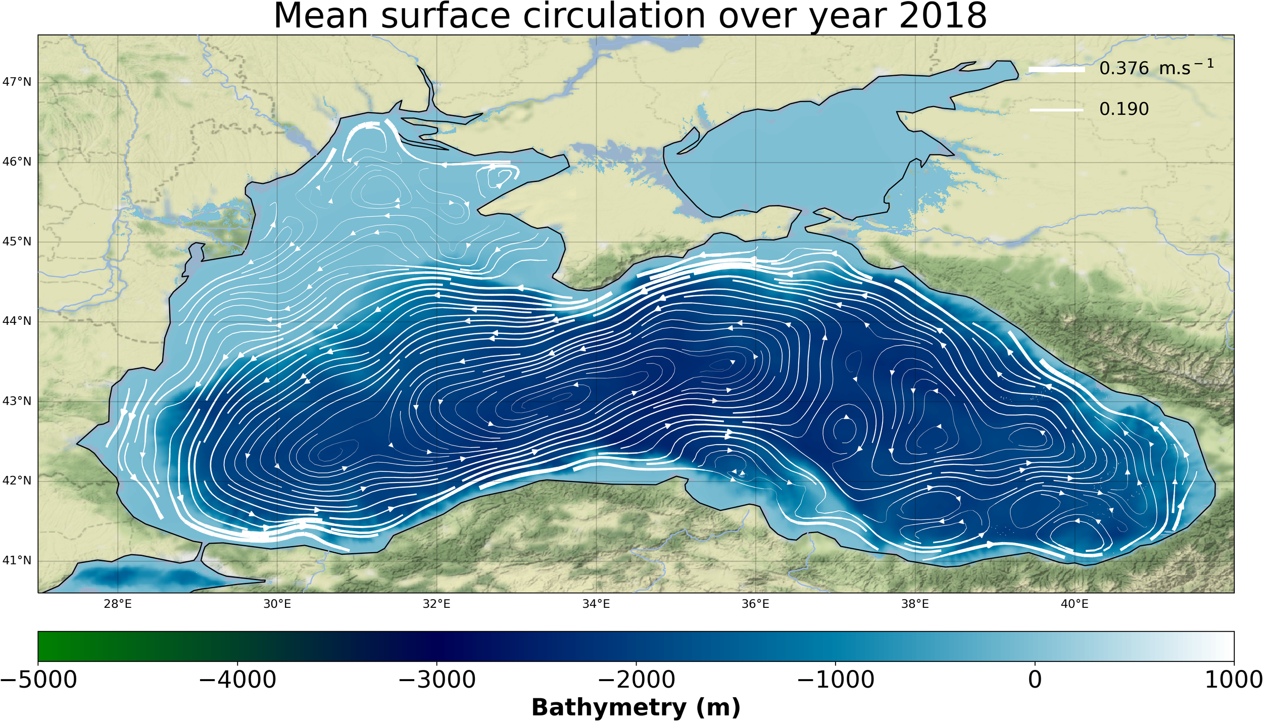 Figure 1 The Black Sea annual averaged circulation (for 2018) obtained with EO4SIBS altimetry products.