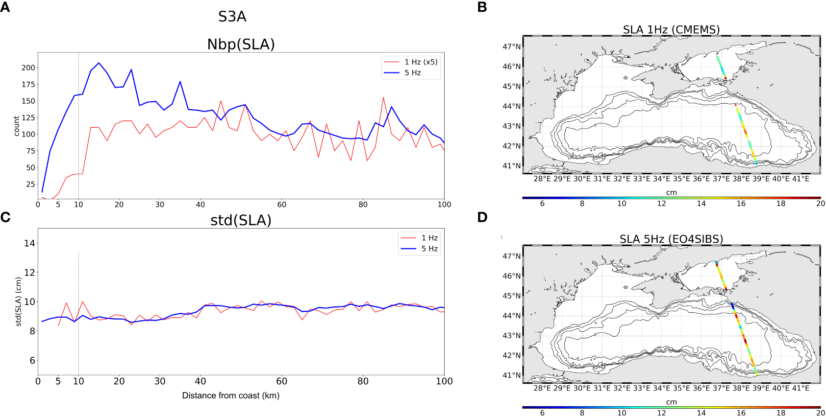 The 5Hz measurement globally contributes increasing the spatial and temporal variance of the SLA signal by 10 to 20% (Supplementary S2). The temporal variability of the signal remains consistent between the 5Hz and 1Hz products up to ~15km (Figure 2). Closer to the coast, the variability observed with the 1Hz product shows two peaks that can be interpreted as errors in the altimeter measurement. At the opposite, the variability observed with the 5Hz product is homogeneous and consistent up to ~1km from the coast, underlining the pertinence of the additional observations brought by this product in the coastal area. This is not surprising since the 5Hz product better samples the sea surface and is specifically processed to better resolve the small wavelengths. An example of the SLA along a track is given on Figures 2B, D. It shows the improved sampling of the surface and the higher intensity of the topographic structures observed with the 5Hz product. In the eastern part of the basin, the gain of measurements with the 5Hz product is higher (Supplementary S2) mainly due to the increased availability of short segments near the coast, not present in the 1Hz product. These differences explain the high gain in SLA variance (~+40%) observed both for C2 and S3A (Supplementary S2).