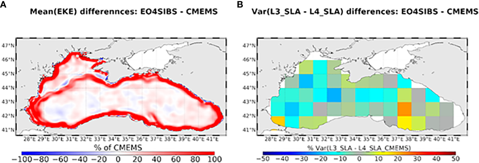 The gridded altimeter product is validated by comparison with independent measurements. Two specific map series are constructed keeping measurement from one satellite (here SARAL/AltiKa with 1Hz resolution from the Copernicus Marine Service) apart for validation purposes. They correspond to the regional product presented in this paper, and conventional regional product available from the Copernicus Marine Service. The independent measurements are here considered as a reference for mesoscale validation assuming that this signal is better observed on raw along-track measurement than on the gridded product. The latter indeed induces a smoothing of the signal. The map series that maximizes the reduction of the variance of the SLA difference between the gridded product and independent along-track is thus considered as the best map series for mesoscale observation. Figure 3B shows the results obtained over year 2017. It underscores a net reduction of the variance of the differences between gridded SLA and SARAL/AltiKa along-track SLA products when EO4SIBS grids are considered. The reduction reaches between 10 to 20% in the main part of the basin, except in the Eastern part where the Copernicus Marine products have better performances. The results also suggest a light degradation along the Crimean and southern coasts.