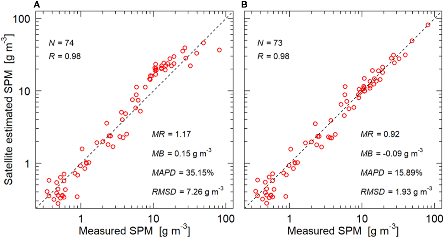 Figure 4 Scatter plot between measured and satellite-derived SPM concentrations; (A) based on the default Nechad et al. (2010) approach, using one single spectral band (λ = 665 nm); (B) based on regional adapted algorithm, which implies the usage of two spectral bands (λ = 665 nm and λ = 865 nm); N is the number of match-ups, R - the correlation coefficient, MR - median ratio between observed and predicted, MB - median bias, MAPD - median absolute percentage difference and RMSD - root mean square difference.