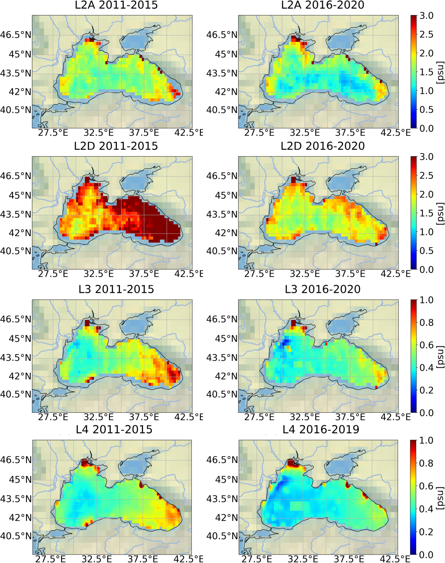 The quality of Level-2 dataset corresponding to descending satellite overpass (i.e., L2D) is generally poor and its estimated error is approximately twice that corresponding to ascending orbits (i.e., L2A) due to a more severe RFI contamination of descending orbits. L2D SSS products are then inappropriate for scientific studies. The error of L2A products amounts to 1.5-1.85 psu, is strongly heterogeneous and dependent on the coverage of the basin by the satellite overpasses. When the satellite overpass completely covers the basin, the quality is much better than when the satellite partially crosses the Black Sea (Supplementary S4 and Figure S4_1).