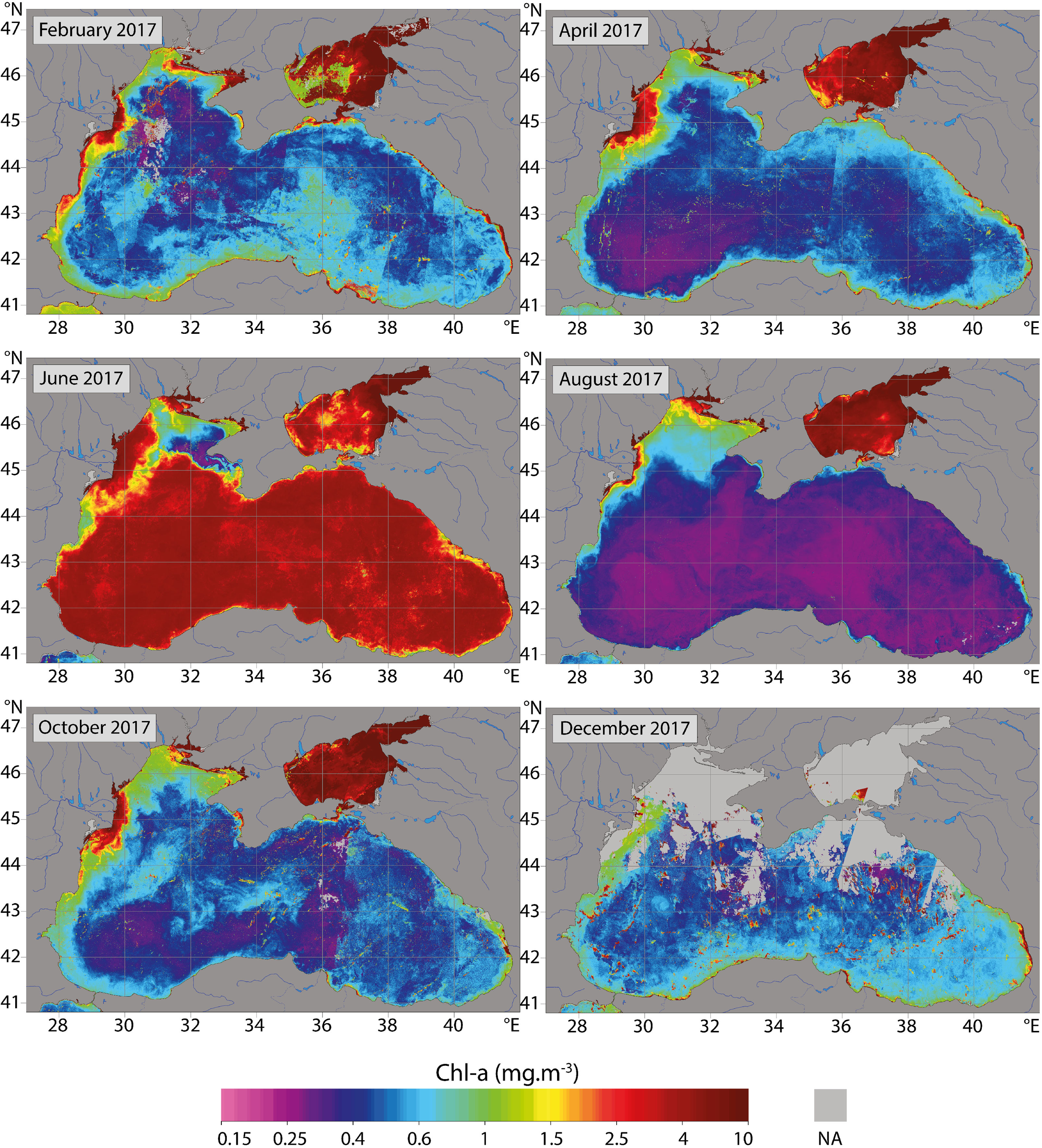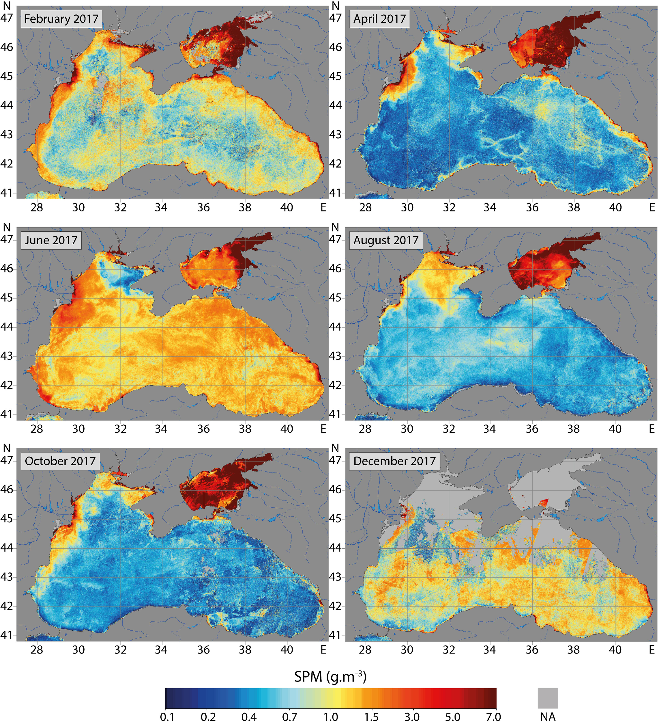In August, an anticyclonic gyre forms over the Black Sea northwestern shelf and transports northward riverine waters. The shelf is occupied by waters with high SPM and Chl-a values that penetrate towards the deep sea via filaments ejected at the shelf break (Figures 8, 9). It is during this period that bottom hypoxia may occur (e.g., Mee et al., 2005; Capet et al., 2013). In the deep sea, surface SPM and Chl-a are very low because the bloom occurs deeper and results in a deep chlorophyll maximum (e.g., Yunev et al., 2005; Ricour et al., 2021). In October, the extension of the bloom over the shelf is reduced due to the decrease of the river discharges and intensification of northern wind (Grégoire and Beckers, 2004; Grégoire et al., 2004).