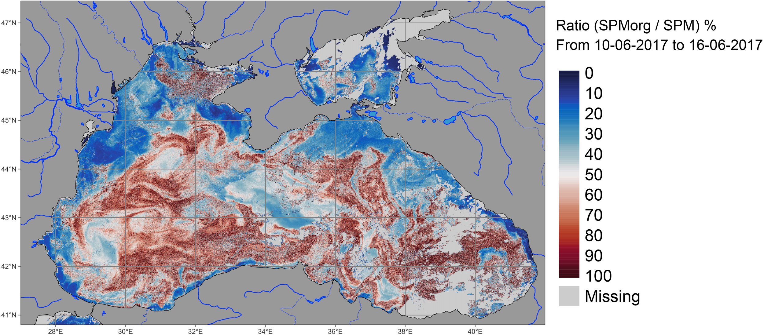 Figure 10 Map of the organic fraction (in %) of the SPM estimated during the coccolithophorid in June 2017 (weekly composite: 10-16 June 2017). This fraction has been computed using the approach described in Babin et al. (2003) (see their equations 1 and 2) using the estimated Chl-a as a proxy of the organic part.