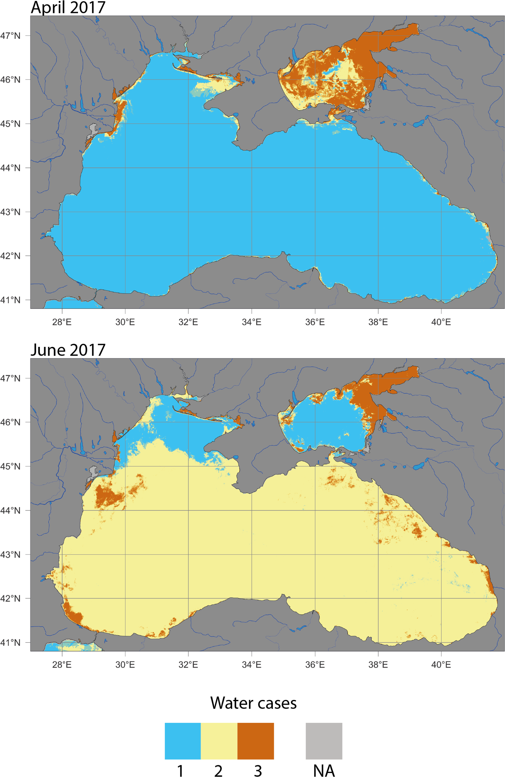 Figure 11 Water classification as Case 1, 2 or 3 (see the text for definitions) as monthly composites in April 2017 (top) and June 2017 (bottom).